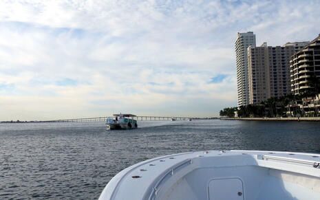 Thanks to a wide variety of fixed and moving targets, the Miami area is a pretty good place to test radars. It may never suffer the near-zero-visibility fog conditions that make the tool so important where I cruise, but a dark night with all sorts of boat traffic masked by sometimes over-the-top downtown Miami lighting must still make a good radar very valuable. This channel along Brickell Key is actually one of the least congested around the city, but I like how the photo also shows the big Rickenbacker Causeway bridge that goes out to the new MIBS site on Virginia Key. I took this photo on the early Furuno demo that began downtown and ended at the show, but proximity to the bridge meant that most demo trips could slip under it to get long radar views south down Biscayne Bay.