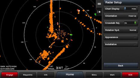 Garmin product manager Ryan Schmitz had a similar answer, but he also pointed out how sea clutter isn’t as important once you’re confident that actual moving targets amongst the clutter will be highlighted. This screen illustrates his point fairly well as the gain on the GMR Fantom 4 is in Auto High mode, but I’m pretty sure that it wasn’t missing any of the traffic around the show. Garmin hasn’t settled on a final Motionscope (Doppler) speed filter yet, but red targets on this screen are coming in our boat’s general direction at over 5 knots, and green targets are moving away from us at over 5. Do you like getting both coming and going info (as I do)?