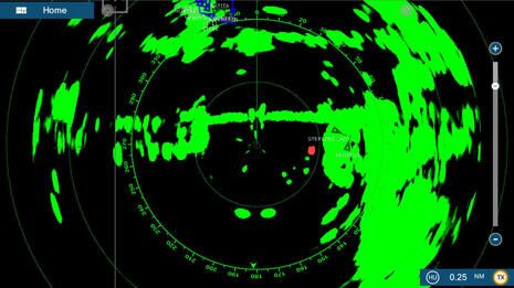 And here’s the Simrad Halo-3 at dual range in nearly the same location. That’s clean, detailed target imagery in the conventional sense, and the true color would show better if we’d set the background to black. As discussed in part #1, both these radars were locking onto and holding MARPA targets quite well during my demos, and of course they offer several other tools for dealing with moving targets like echo trails and easy EBL/VRM marking.