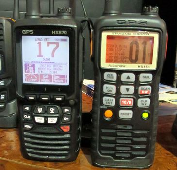 I was impressed with Standard Horizon’s original HX850 and I’ve been happily using the slightly upgraded HX851 model above for several years. It’s a fine handheld 6 Watt VHF (if you don’t mind the size) plus it’s always ready to place a DSC distress call and/or navigate a life raft (or tender or kayak or…). But, wow, look what they did with the new HX870 model: The screen is at least twice as large, the interface seems usefully updated with soft keys and icons, the battery is substantially larger, and more.