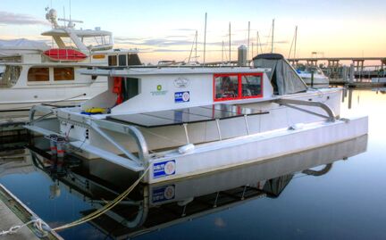 The system uses 14 solar panels (245W Kyocera) to charge the two battery banks used to power the 48-volt electric propulsion systems.