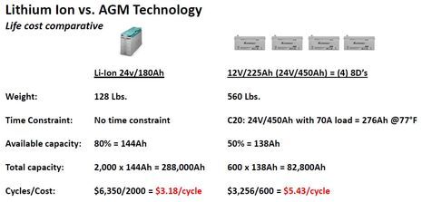 What may be more controversial is Mastervolt’s analysis of Li Ion costs versus AGM batteries, though it’s certainly a conversation starter. Gizmo’s 12v house bank, for instance, is two Deka 250 Ah 8D AGM’s that are at least 6 years old now and may well have exceeded 600 cycles (and a fair bit of owner abuse). I can tell that they are near the end of their working lives and replacing them will require more muscle than I have, but it looks like the cost will not be as bad as suggested below. But the main thing to notice about the analysis is that you really have to use your boat a lot to make it work. I don’t know how exactly many cycles the VOR 65’s will consume during their long circumnavigations, but it seems like they could use the same batteries for a couple more!