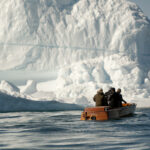 Wrapped in a sticky cotton-candy kind of fog, we have just reached 66 degrees and 33 minutes North—the Arctic Circle. Ash Buchannan and Nick Berner, our young companions on this trip, began their initiation of a crawl, a dance, and a drink of giant-squid blood to earn an Arctic Circle certificate. I was droning King Neptune’s warnings and welcomes plagiarized from the Royal Navy archives when a cannon boomed, sharp as thunder. In the completely calm air the sound carried far—this berg, probably about to crack and roll over us, was three miles away.