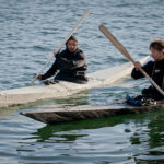 By then the coastal waters were mostly free of ice. During the passage north on gentle seas rolling under patchy fog, the only excitement came from the heavy breathing of unseen whales, and the frantic splashing of seals following feeding dolphins. The last 80 miles on the inner route to Aasiaat meanders through a maze of skerries, islets, promontories, and lots of ice. The forces that wedged enormous towers of ice so far inland defied imagination. A few low growlers penetrated into Aasiaat’s harbor and bumped into the wharves. Not daunted, the local kayak club put on a show of cold water seamanship. The Irish expedition yacht Killary Flyer brought sea kayakers with them. Greenland’s famous champion demonstrated for them all 31 Eskimo roll recovery techniques, qajaq after all is an Inuit invention a few thousand years old.