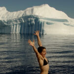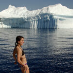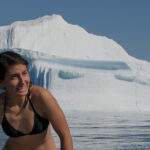 Out in fog-bound Disko Bay the radar painted frightening armadas of solid blobs. All these icebergs were coming from a tidewater glacier in the southeast corner of the bay. Fog in the lee of icebergs emitted a ghostly glow. On occasions the dark sea suddenly gleamed green—a color of danger—some seven-eighths of a typical berg hide beneath the water, with shallow spurs jutting out. When the fog thinned, we saw ice castles, arches, dry docks and amphitheaters ahead, behind, to port, and to starboard—the seascape scintillated. Now, whenever we passed near a particularly threatening berg, Ash and Nick jumped in for a quick dip. Afterward, they declared, the cold breeze on deck felt almost tropical.