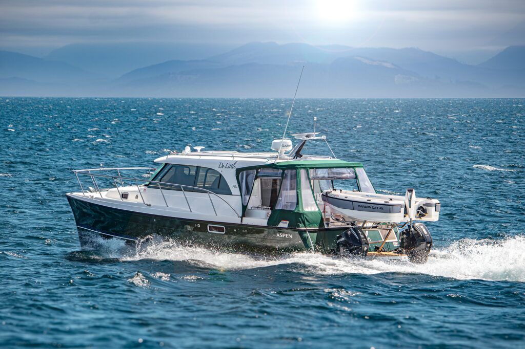 The sun broke, illuminating vast golden beaches on shore. Aspens were practically leaping over the wave crests. Boats behind us disappeared into the troughs, with only their flybridges poking above the blue. All embraced being an aquatic version of an offroad rally.