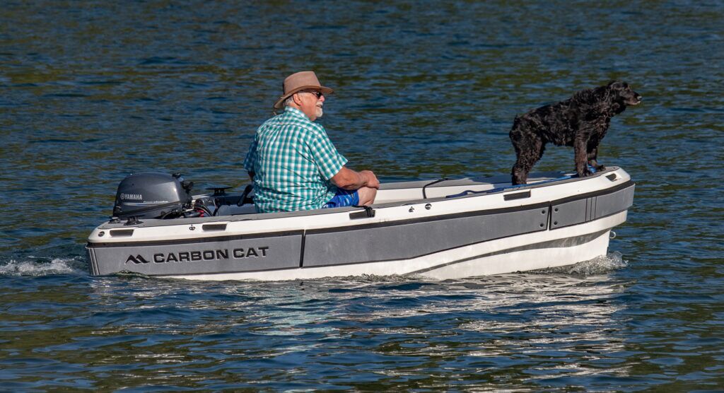 I was aboard the boat owned by Larry Graf, founder and owner of Aspen. Also aboard the C100 Cat Man Do was his loyal pup, a black field spaniel named Daisy. She took her place at my side by the copilot seat. Nearby, Hull No. 1 of the new flagship, the 44-foot C128 Susie Q, cruised with owners David and Susie Gatling at the helm. They’d been handed the keys the day before in Anacortes, Wash.