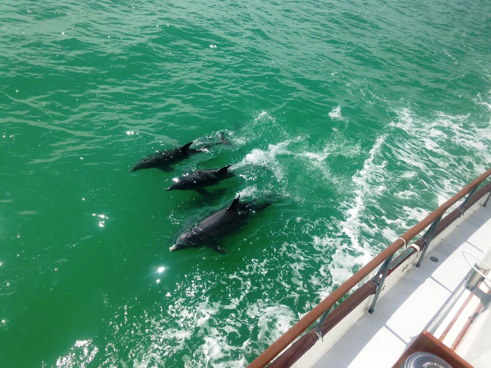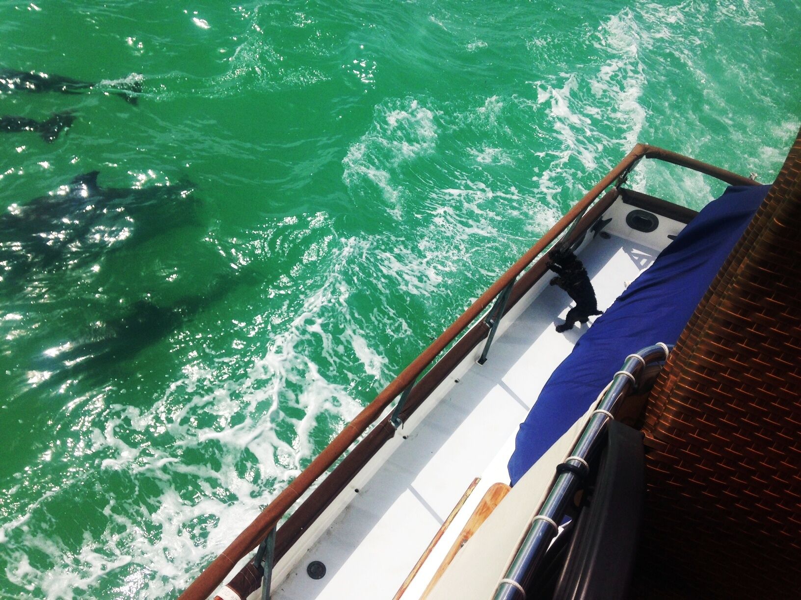 As we cruised from Matecumbe Key to Plantation Key we were greeted and entertained by a group of five dolphins that put on the greatest show I have ever witnessed. Let me share this event from Baci, my 12 lb. Schnoodle’s perspective: