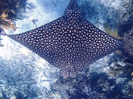 Countless varieties of bright fish swam by us, as we glided over the wide array of colorful corals around us.The girls wanted to see one of the large spotted eagle rays that often frequent this reef. We so hoped that one would oblige. They tend to run over the sand in about 15 feet of water just off the reef. Well, we left the center of the reef and moved along the border where white sand meets a mountain of coral. I must confess that I was somewhat skeptical that our magnificent butterflies of the sea would swim by us. I was getting ready to give up when a large dark creature began to appear from the depths.