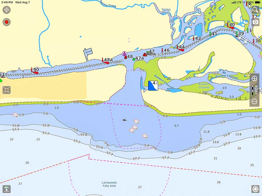 Dori ArringtonFor years, the sound advice when traveling the ICW was to look outside, be sure to keep your boat in the visual center of the waterway, and not follow your navigation app or chartplotter too closely. While this is still good advice, the detailed information available today allows navigation apps to offer a much more accurate route to follow.