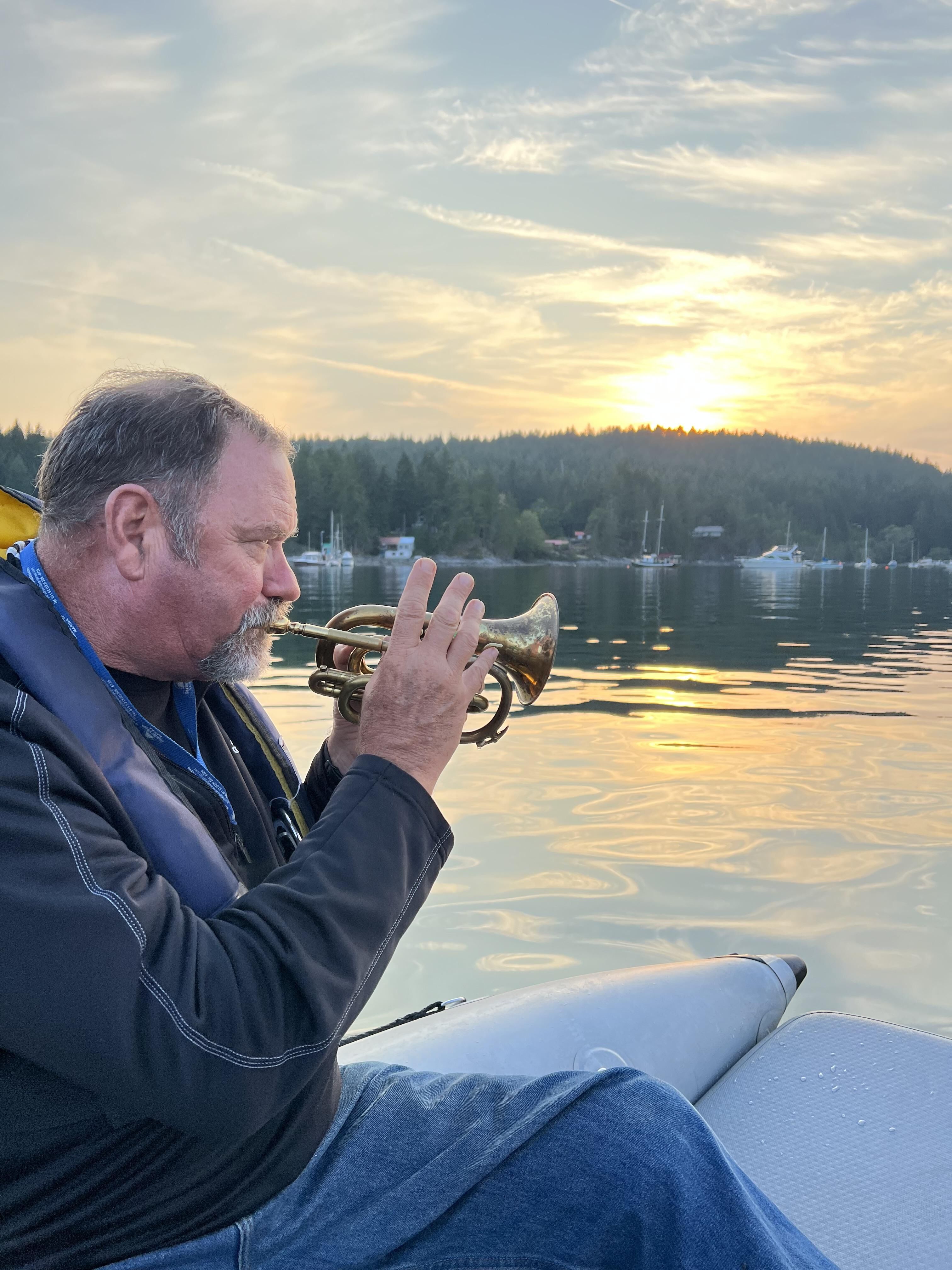 We did not see as much wildlife, unless you counted parties at the dock. Playing music was different, too. When Steve brought out his trumpet, an international group of onlookers urged him to perform “O Canada.” Every evening, we puttered around the bay in the dinghy while Steve gave a trumpet concert for a cheering audience of boaters, anchored and at the dock. People took photos of us. One woman hollered her approval as she shot a video from the deck of her boat.