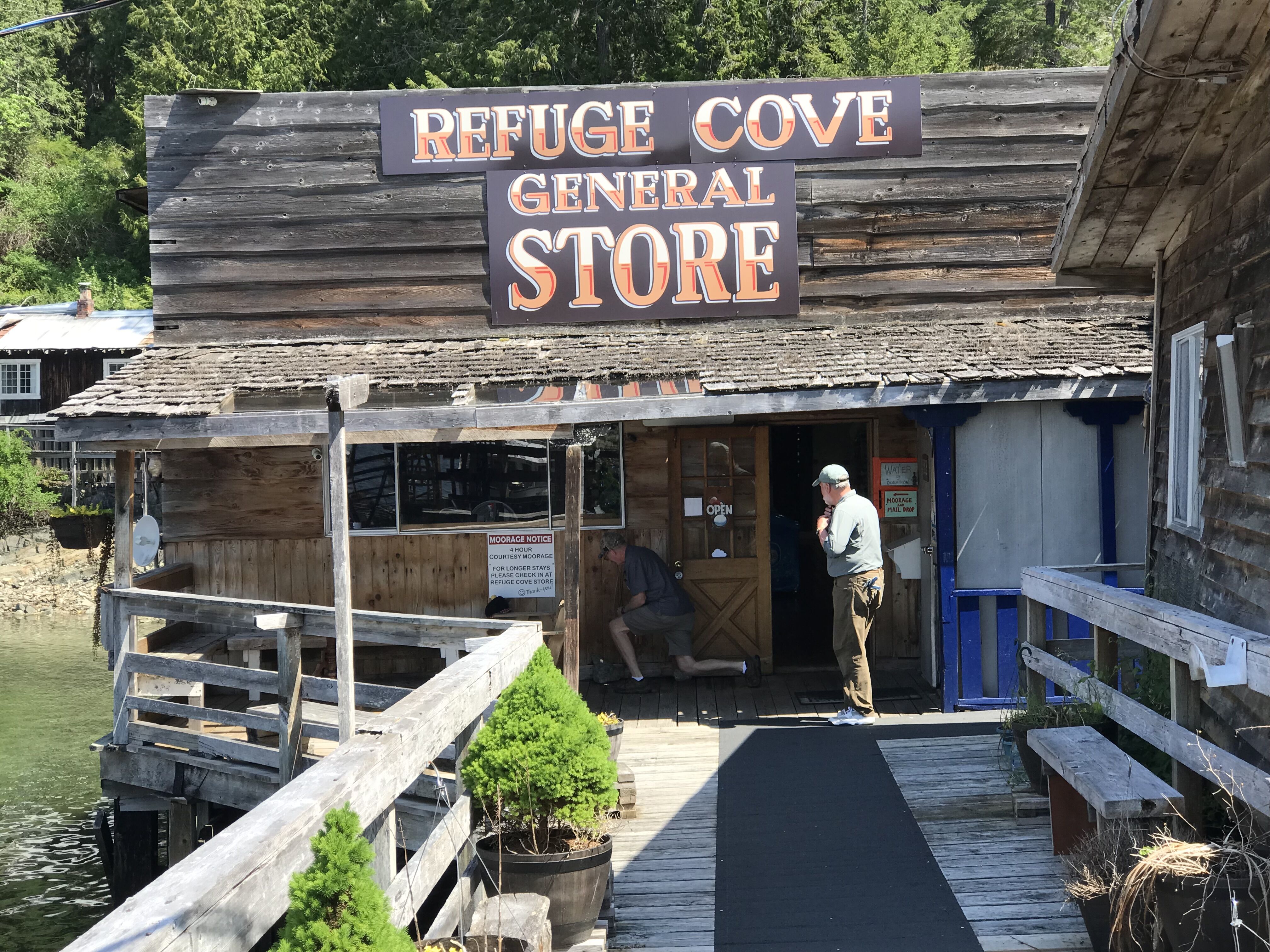 A few days later, we resumed our voyage north. Teakerne Arm, with its thunderous waterfall dropping straight into the sea, was an easy stop. We were able to view nature’s majesty up close, maneuvering straight into the spray. And we could not resist visiting the store at Refuge Cove, on the southern tip of West Redonda Island. Reached by a wooden gangplank and surrounded by structures sagging with moss, the store has an early waterfront vibe that leaves customers wondering what year it is. We selected a few dusty bottles of wine from last year’s inventory.