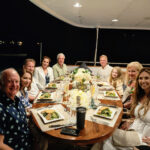 Dinner in the cockpit includes family. The boat’s namesake, the Giles’ granddaughter Vivian Rae, is on the far right side of the table.