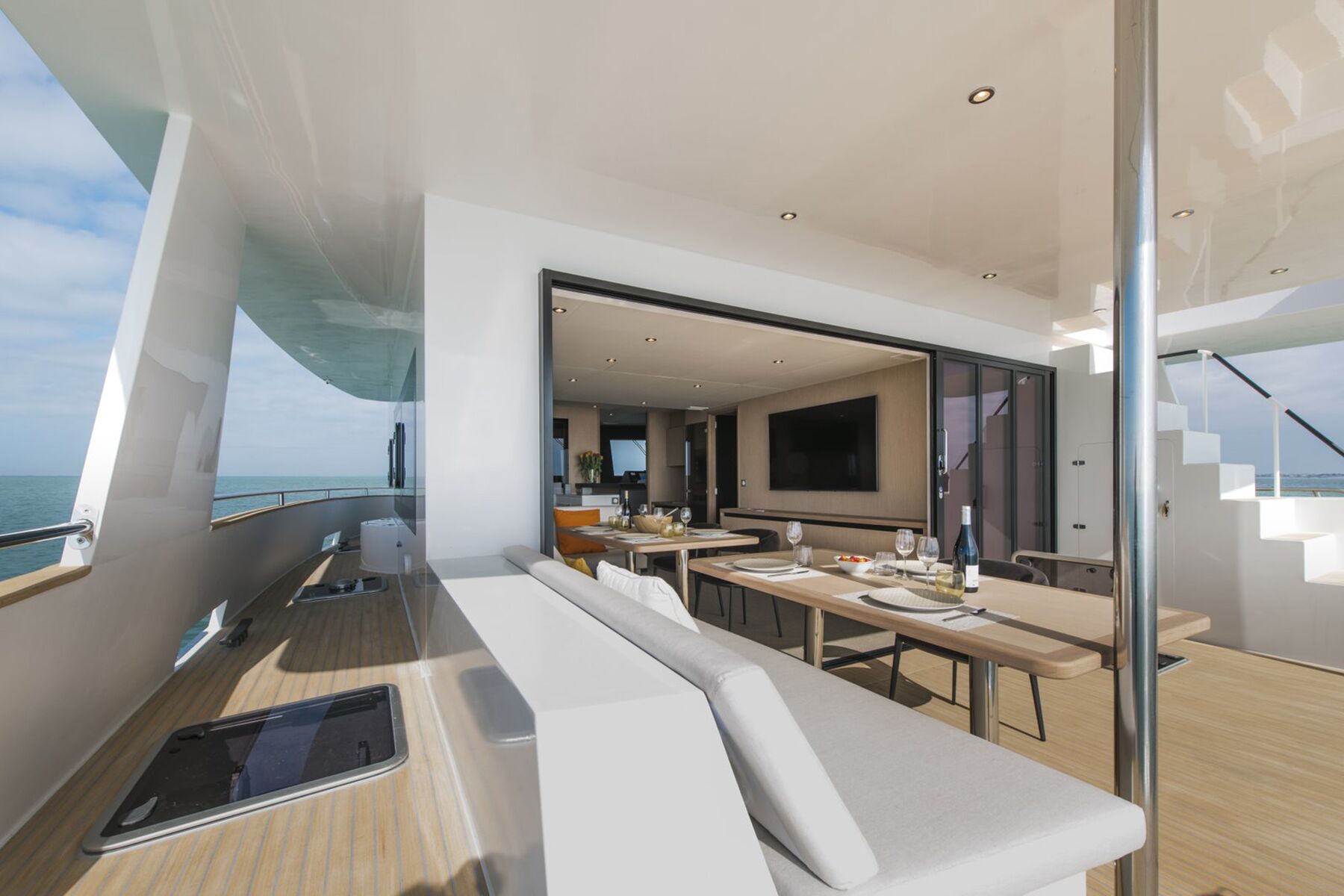 Brieuc MaisonneuveAt last, I had a chance to take in her salon. With more than 27 feet of beam, the area has room for dining, a galley and separate lounging space. I could access the flybridge via a wide, external staircase, and, when we pulled into port, her wide side decks with high bulwarks ensured safety as we handled lines.