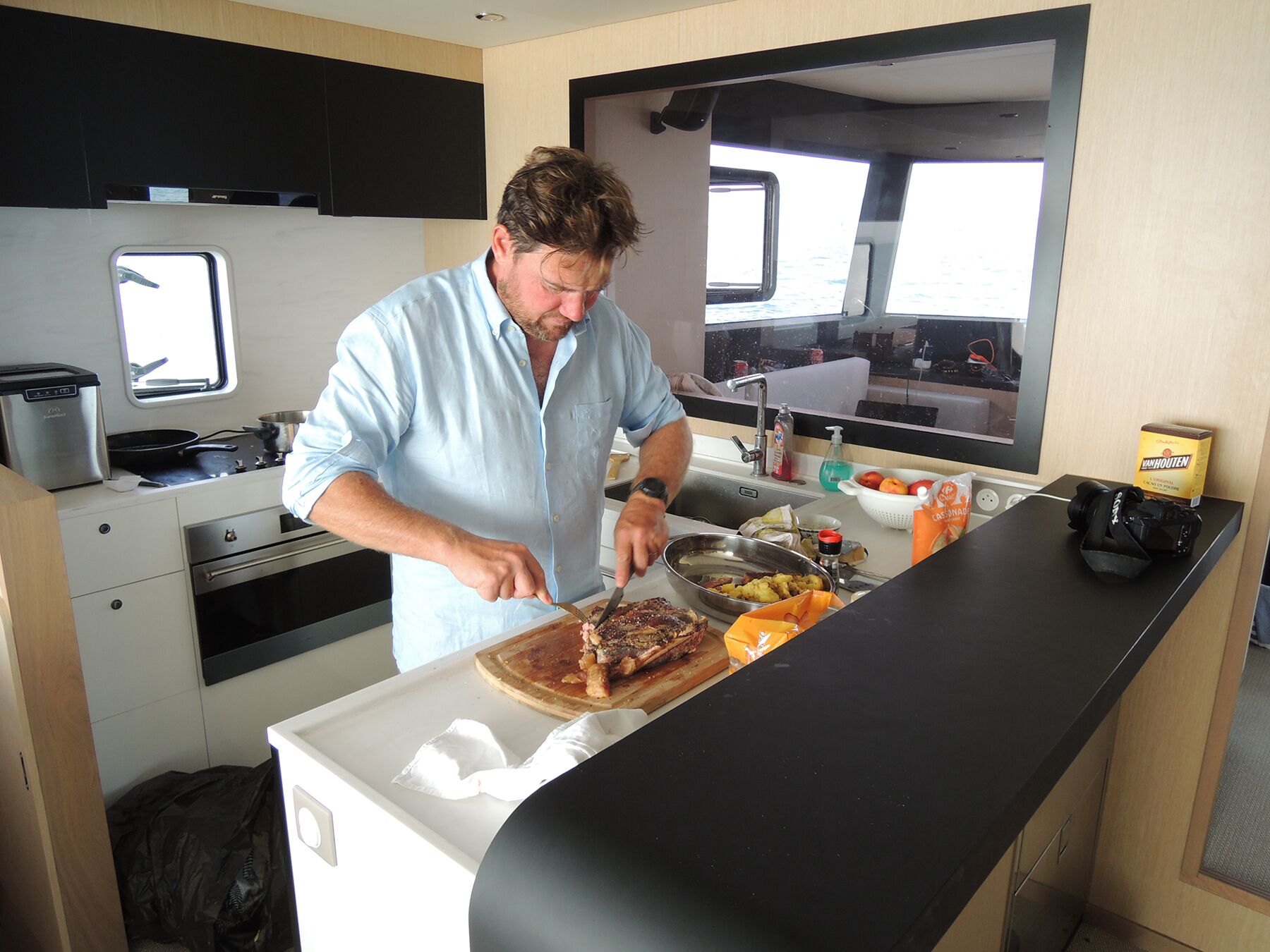 Brieuc MaisonneuveDay four found us steaming up to Port Ginesta, an attractive marina near Castelldefels, southwest of Barcelona. The seas were building, but even so, the boat’s stability allowed Maisonneuve to prepare us all a tasty meal of tagliatelle with chicken and cashews, plus a lemon pie for dessert. As we enjoyed our lunch, the main engine was silenced, and we cruised on the electric motors alone. It’s a lovely experience, but even with the main engine running, the 56 is a quiet boat. From the flybridge, wind and wake completely drown out the sound of the engine.