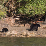 A black bear and her cub along the water’s edge.