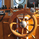 A classic trawler touch, a wooden spoked wheel.