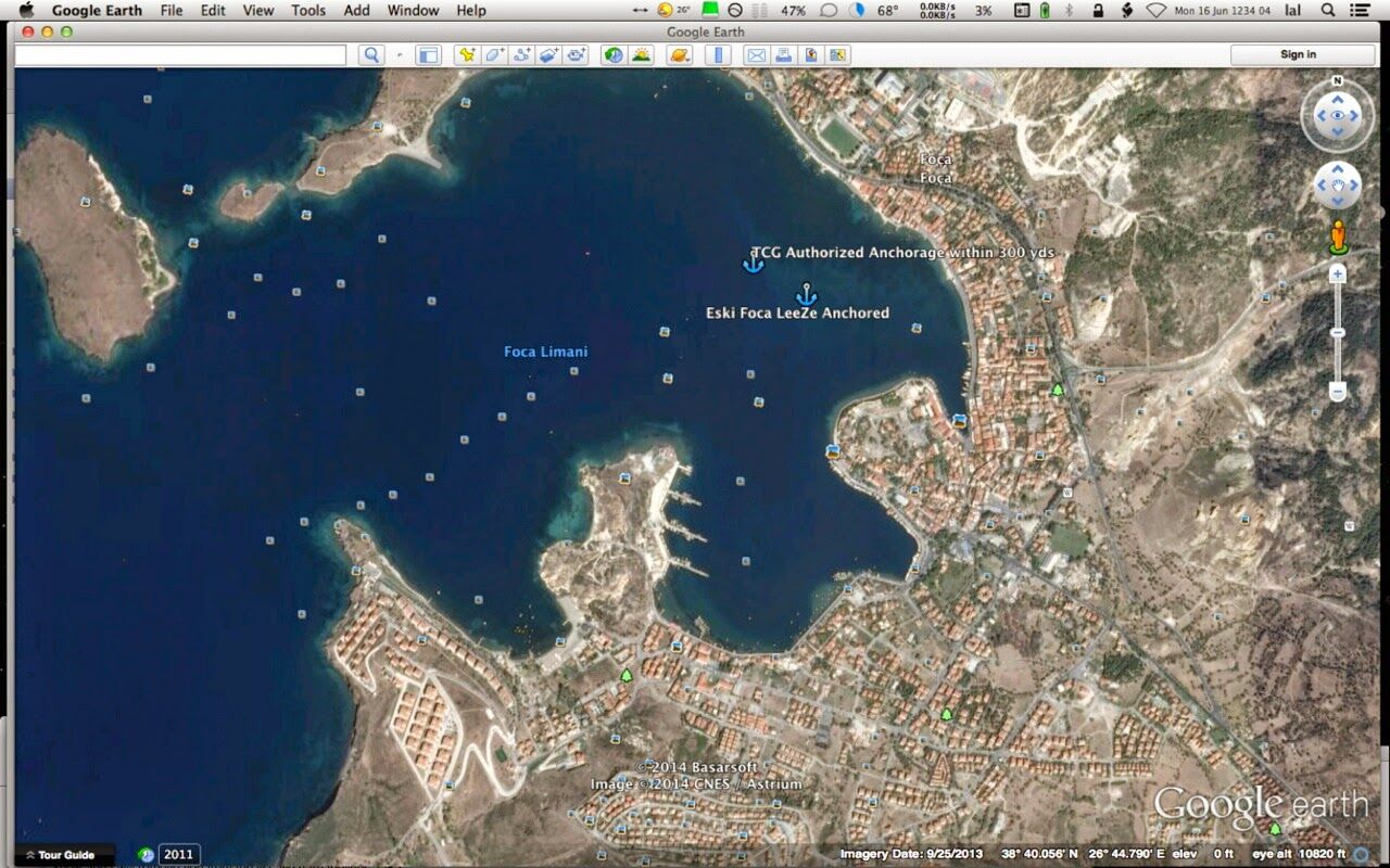 Next, I called the Coast Guard (for those in Turkey their country wide phone # is 158) and asked them. They had not a clue either but offered to find out and get back to me. About 10 minutes later, their Izmir Operations Center called to tell me that I was authorized to anchor within 300 yards of 38° 40.380’N, 026° 44.880’E. Getting somewhere!