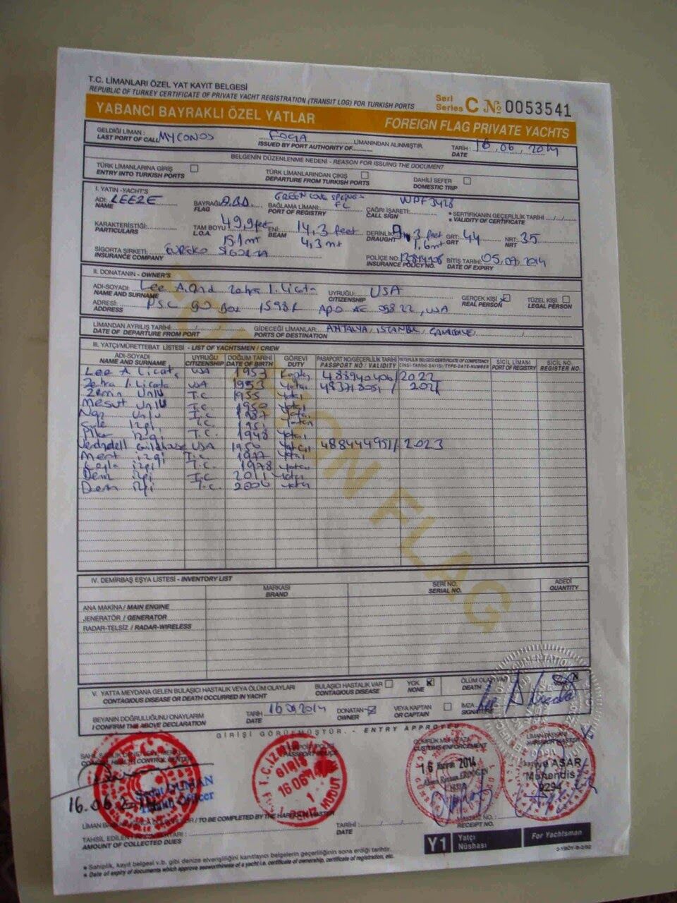 (This log is good for one year and expires 16 June 2015. One can renew at that time for another year without having to leave the country. One can do this 4 more times but on the 5th renewal, the boat must leave Turkish Territorial waters. The boat does not have to stay out long, at most one day, but it does have to depart.