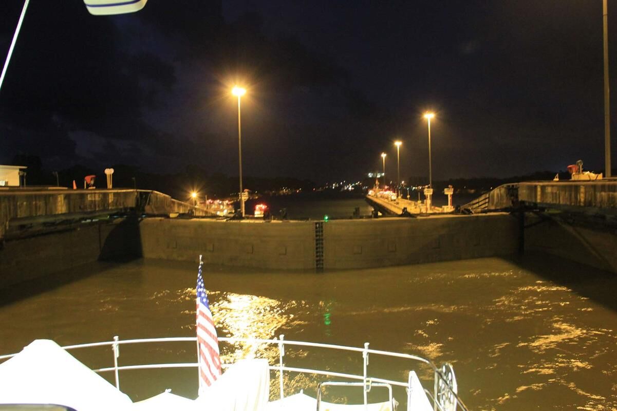 Our transit was scheduled for 1530, but we didn’t actually get into the lock until 1915. The sun had set by the time we entered the first of three locks in the Gatun series. When we entered the lock we tied up to a steel workboat that preceded us. After the workboat tied up to the wall, we came alongside and tied up to her. The task appears pretty straight forward, but wind and turbulence in the lock, combined with jittery nerves, large objects confined to a small space and the possibility of jagged steel scrapping Argo made for a little tension. The hands threw lines forward and aft as well as two spring lines. Argo was safe and secure, and after repeating the process through two more locks that evening, everyone felt pretty comfortable. We cleared the last lock around 2100, we moved in total darkness to an anchorage for the night. As we latter learned, southbound ships transit only at night, and yachts must anchor in lake overnight and proceed southbound in daylight. We got under way with a new pilot named George (an American who has worked for the canal 42 years) at 1000 the next morning. We completed our transit about 1600 and tied up at our dock at La Playita Club at 1700 on April 1.