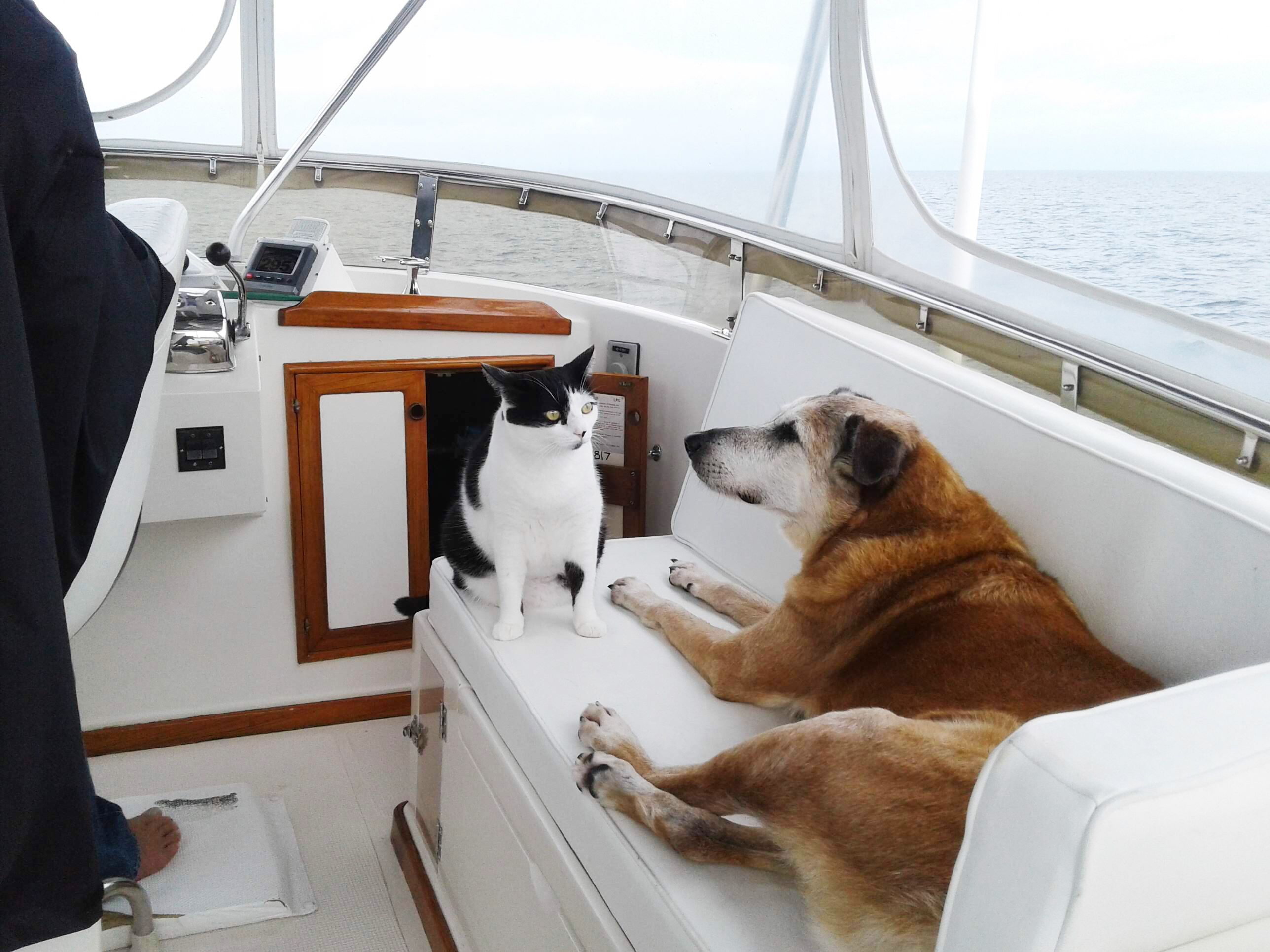 After a day’s cruise, when we are safely anchored or docked and the logbook is updated, sitting on the sundeck is our relaxation spot, taking in our surroundings and enjoying a cold beverage. We also like sitting at the bow with the chairs tilted back to watch the stars. Our cat, Lima, and dog, Kilo, always join us.