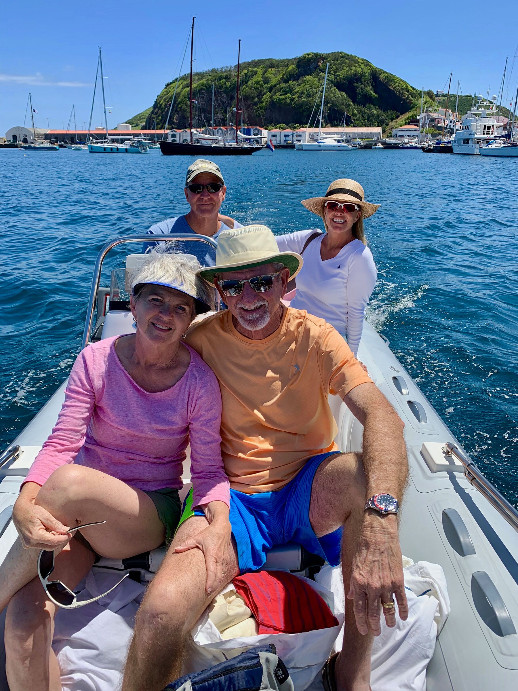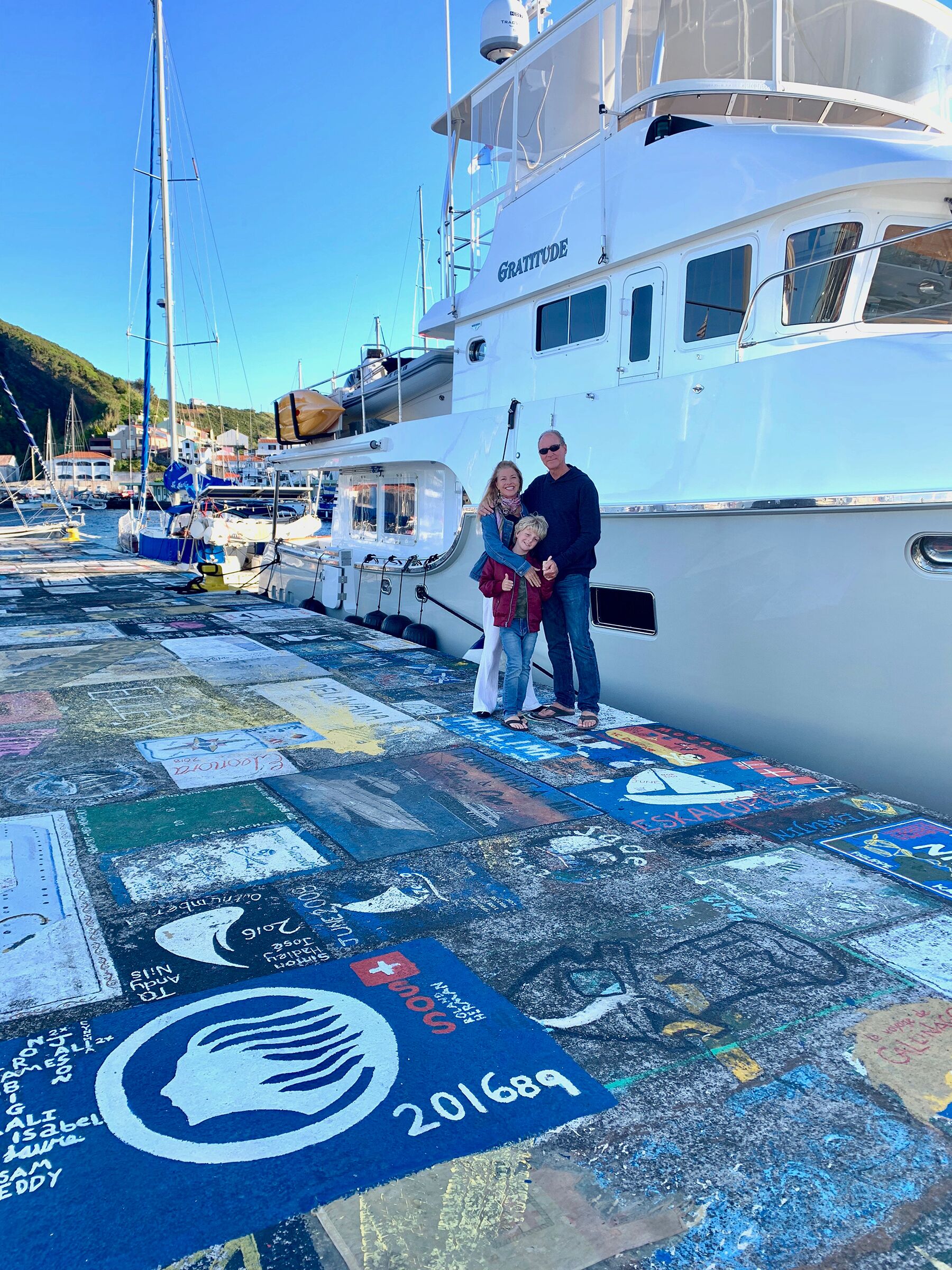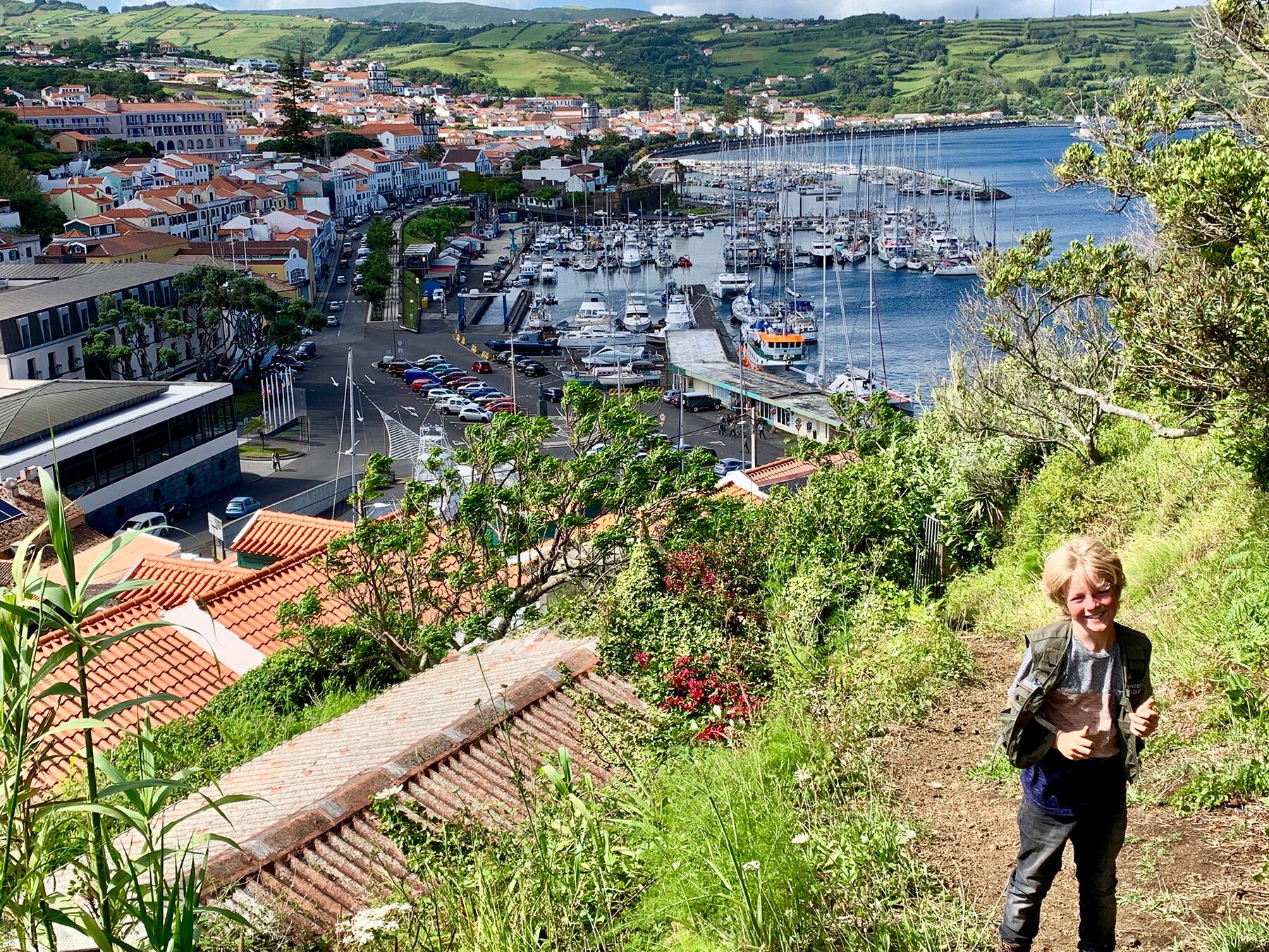 We’d arranged the services of a handler in Horta, so all of our fueling, paperwork and immigration tasks were managed for us. Thus began the wait for Jack and Janie, his adult traveling companion. The day before their arrival was spent moving crew to another stateroom and preparing Jack’s room. Even Pratt and Whitney seemed to sense his return. The morning of his arrival, we traveled to the airport, where we paced for nearly an hour awaiting the plane. At last, we watched Jack emerge on the tarmac. We jumped and cried for joy as he ran up the steps, leaving Janie to carry all of his bags. That first day was our own to reconnect and be a family, our happiest day since we left on our journey. The following three weeks of weather delay let us enjoy world-class hiking, as a family, in Horta and on the neighboring island Pico.