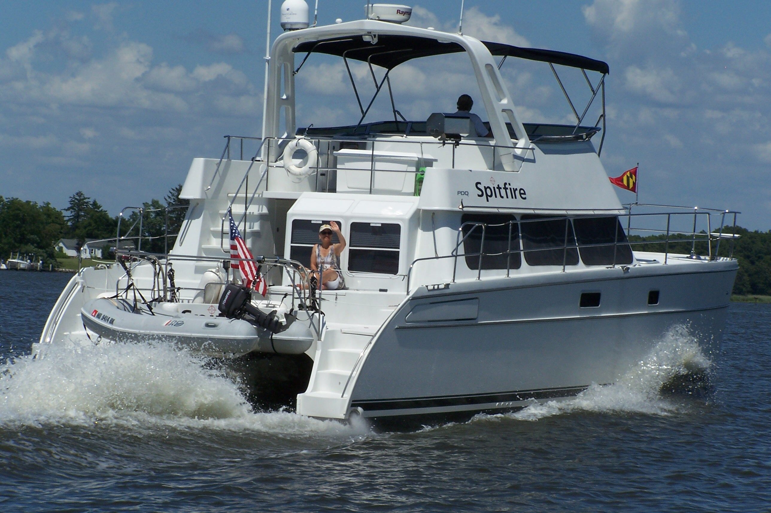 Spitfire is a 2007 PDQ 41, hull number 8 of the 11 built by PDQ Yachts before it closed its doors in the failing economy. We’d been aboard them at the shows, and I did a boat tour of the Richardsons’ Sleigh Ride back in 2008 (see “PDQ 41,” PMM May/June ’08). Our 41 was the first boating experience for our newly rescued puppy, Annie, when we went for a ride with friends Dick and Carol Tuschick of Rhumbline Yacht Sales. I recall standing on the forward edge of the wide foredeck as we ran along at 18 knots near the St. Lucie Inlet, a pair of dolphins swimming up to us in the beautiful water.