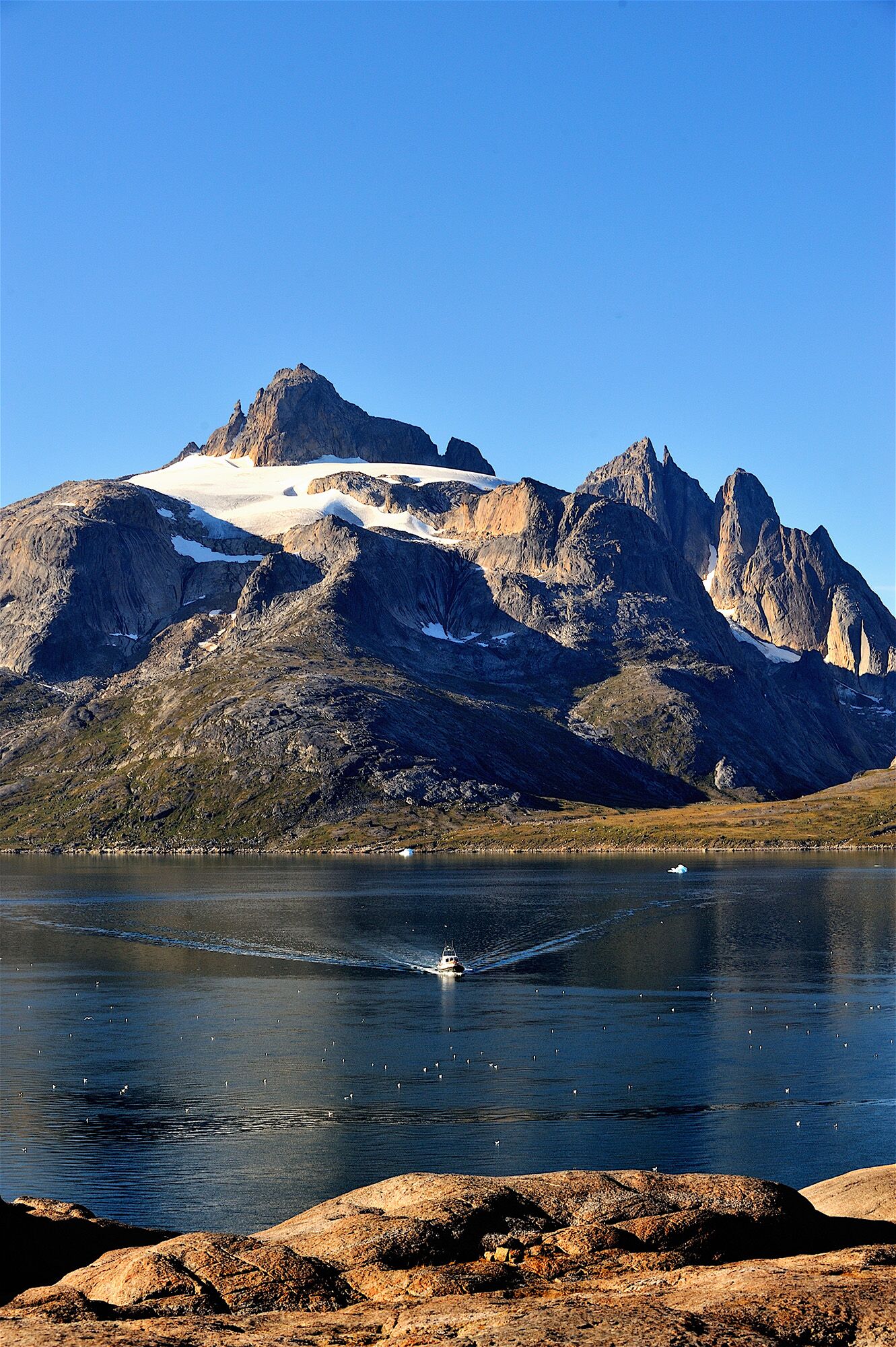 The next morning I take the opportunity to shoot pictures and footage, surrounded by the stunning fjords and mountains. Armed with a mobile mariphone, I direct Four Seasons along the prettiest route. It is amazing to see the No Limit, not a small boat itself, pale into insignificance at the overwhelming beauty and magnitude of this land. After filming, we depart for Nanortalik, the capitol of the southern part of Greenland. It promises to be a spectacular cruise.