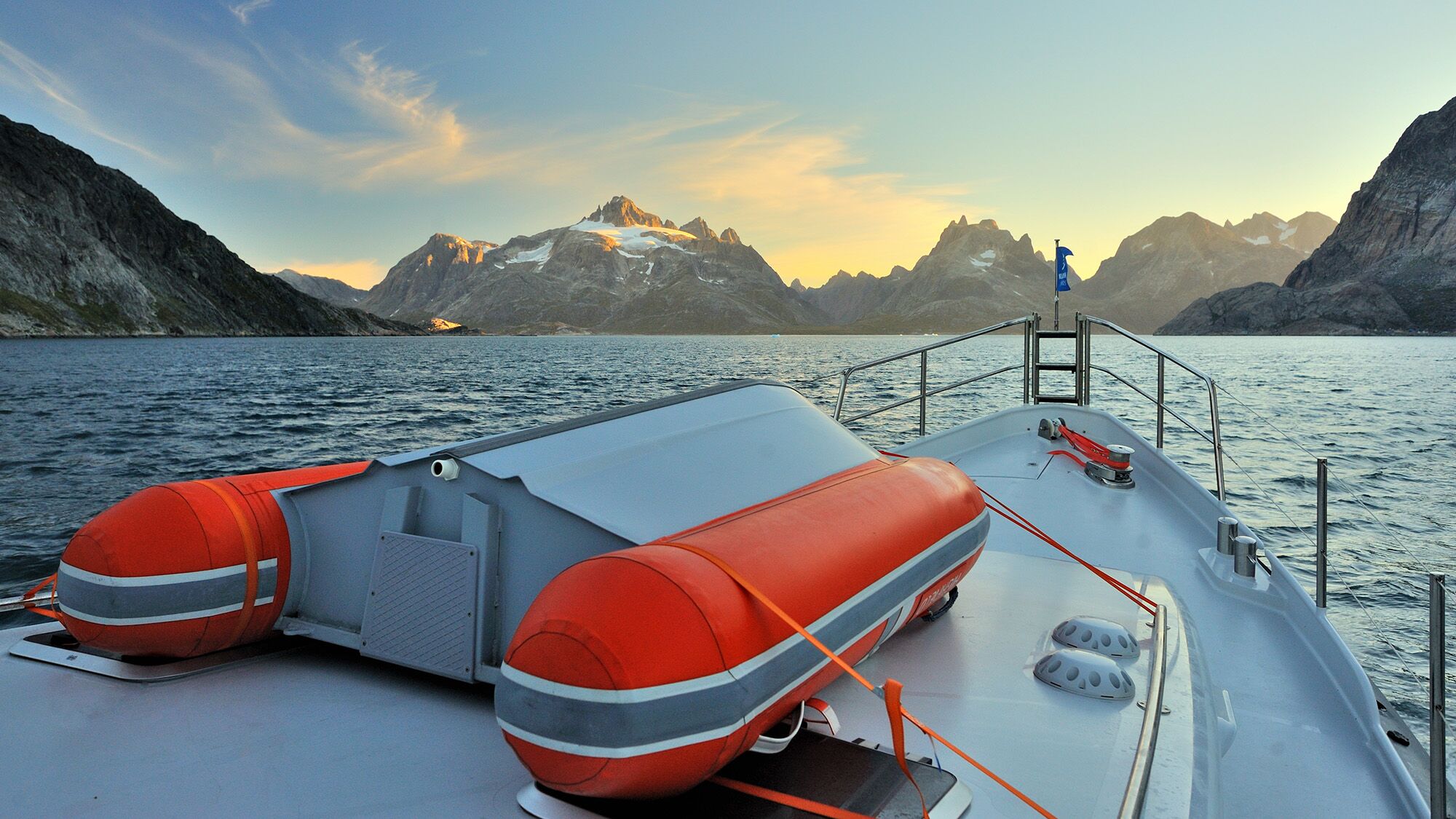 After three straight days and nights of sailing, the mountain tops of Greenland appear. White and blue, covered in glaciers and snow. Excited, we gaze through the monocular, trying to spot icebergs surrounding the cape heading south, before continuing their way northwest. Soon we find a few, despite the summer season, and many more would follow.