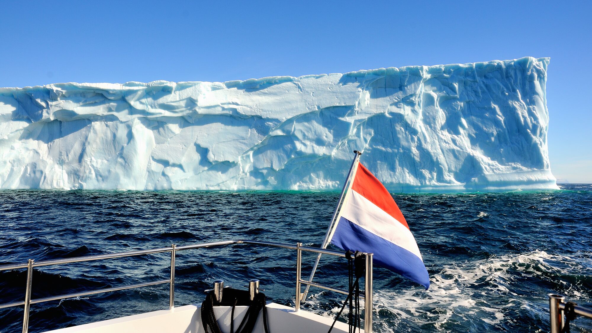 Back at sea, a little off the coast, we encounter a so-called tabula, Latin for table or iceberg. A rectangular, colossal clump of ice, about the size of a cruise ship. We sail toward it and circle it. Impressive, whimsical, and threatening all at the same time. The exterior shows fracture lines, which, together with the melting sunlight, eventually caused the ice lump to collapse under its own weight. No less than a mile away, we witness its violent collapse, causing not insignificant tidal waves. We were lucky. This ended up being a good lesson in why not to get too close to icebergs or calving glaciers.