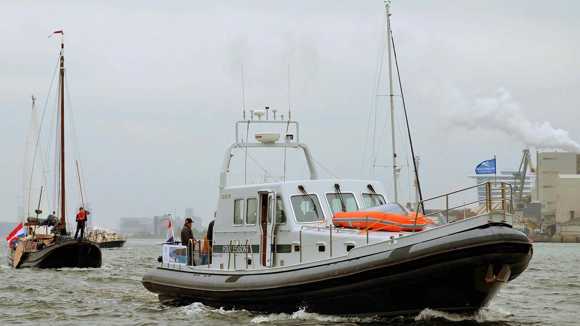 The ocean awaits, but first the English Channel must be crossed and after that, the North Sea. A strong southwest wind is blowing at 6 to 7 Beaufort, with peaks of 8 to 9. These conditions are not a problem for Four Seasons, having two 575-horsepower Volvo Penta engines, a ¼-inch steel hull and aluminum superstructure. Her robust tubes all around soften the motion and give her all the stability she needs. Besides, during an earlier 2,500-mile trip from Amsterdam via the Bay of Biscay to the Mediterranean, we had already gotten to know Four Seasons quite well. At sea, we experience once more how busy the Channel is.