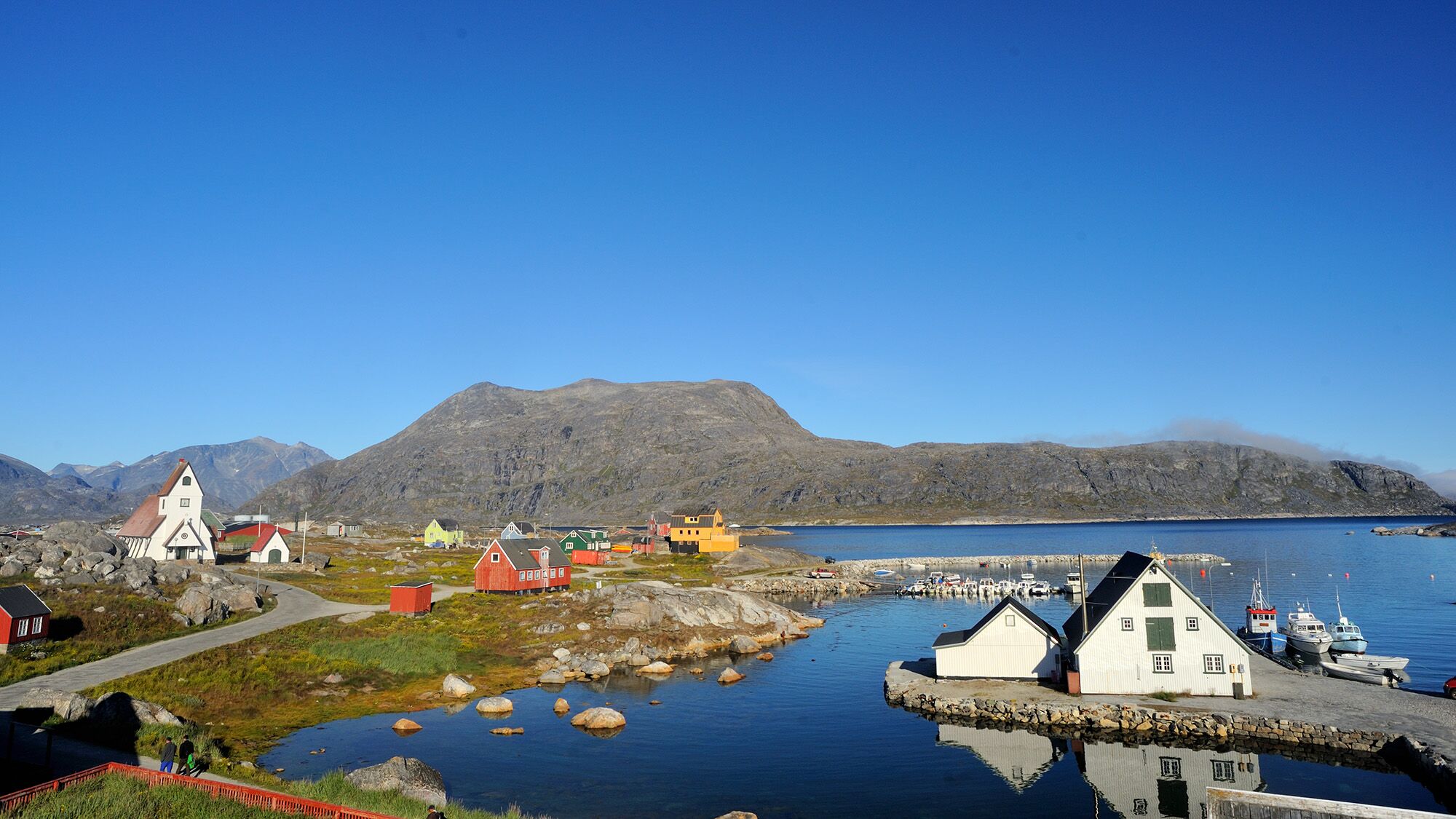 Sailing the Christiansund canal is overwhelming. The surface is full of ice floes, drift ice, small, irregularly yet gracefully shaped azure-blue mountaintops and the remains of glaciers disappearing into the water. Not a single life form or activity to be seen for miles. Only the ever-present seagulls continue to accompany us. At the end of the canal, at a point where several fjords come together, we approach Aupilatoq, a small, secluded Inuit settlement at the foot of the mountains, with a naturally formed harbor. We are welcomed by a couple of silent but friendly and helpful men. Communication is difficult. We learned they also speak Danish, but, we speak neither. Aupilatoq has no more than 180 inhabitants and consists of a collection of colorful, typically Greenlandic cottages, a small church, a community house, a fish-processing factory and, on the hilltop, a satellite radio system and helipad. The village can only be reached via water or sky. The harbor is crowded by many fishing boats, the primary source of the village’s income.