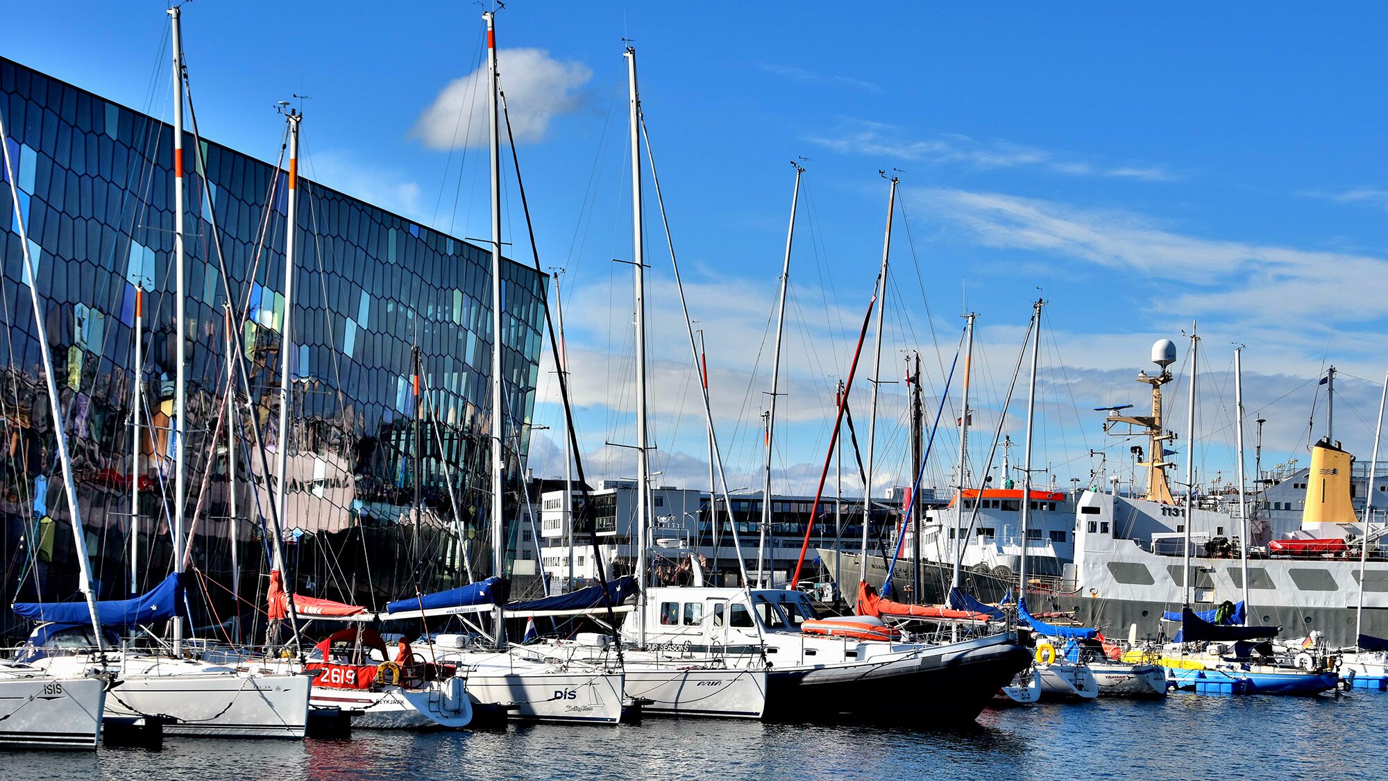 We near the cape of Reykjavík in the fog, but after we arrive, a cautious sun starts to shine. Some family members have arrived in Iceland for the next few days and wave at us from the quay of the marina, right behind the Harpa, a brand-new theater and music hall cubicle shaped out of blue glass.