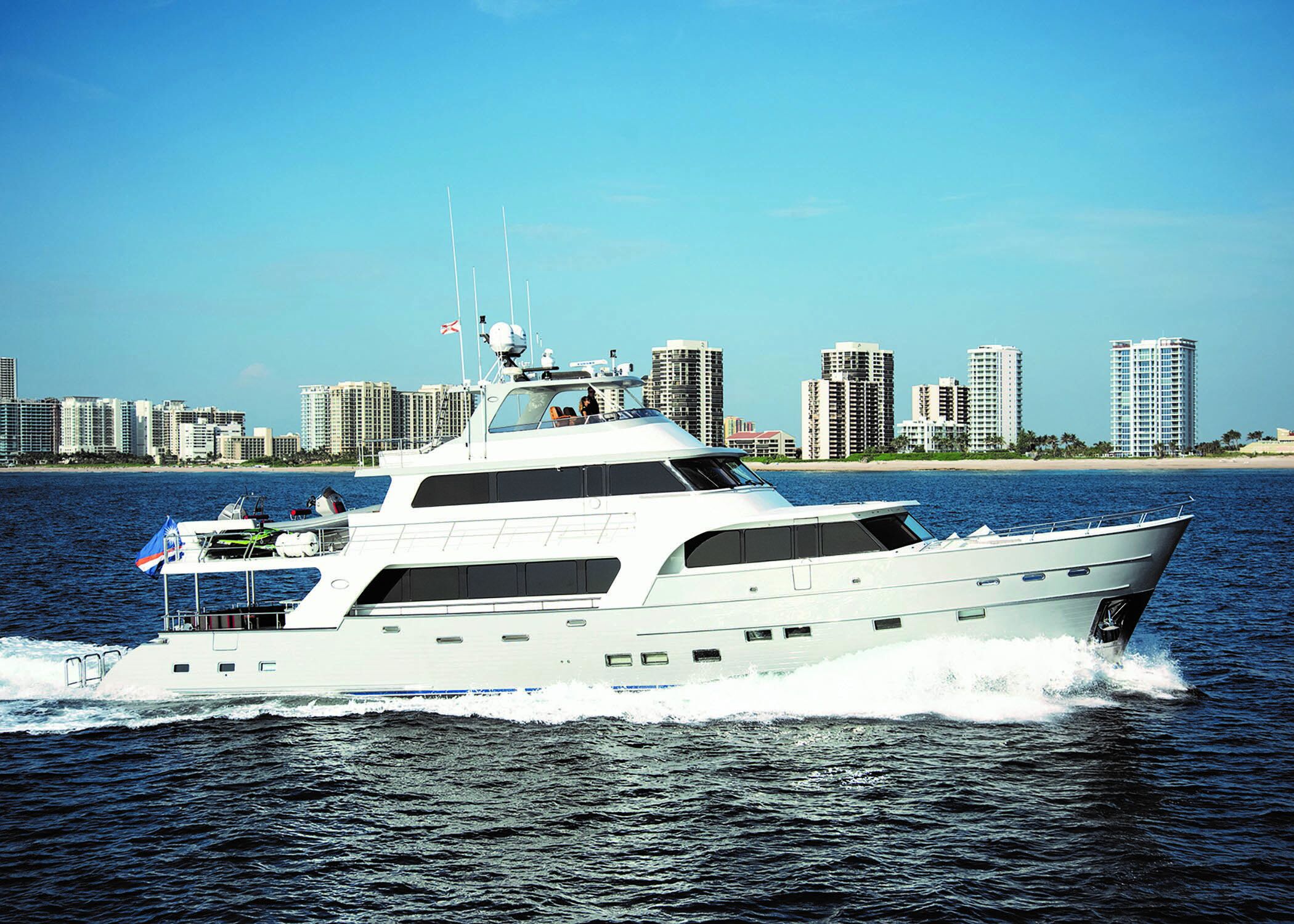 Hull No. 2 has four sumptuous owner-guest staterooms below with an aft crew cabin. She features an enclosed Command Bridge model that includes a four-person hot tub along with a Skybridge above the Command Bridge complete with helm chair and sunpad. Within the functional and luxurious Command Bridge, the Captain will enjoy the privacy of a lovely stateroom complete with private head and shower en suite while guests in this incredible Command Center have a separate and spacious head as well as a full refreshment center and luxurious seating.