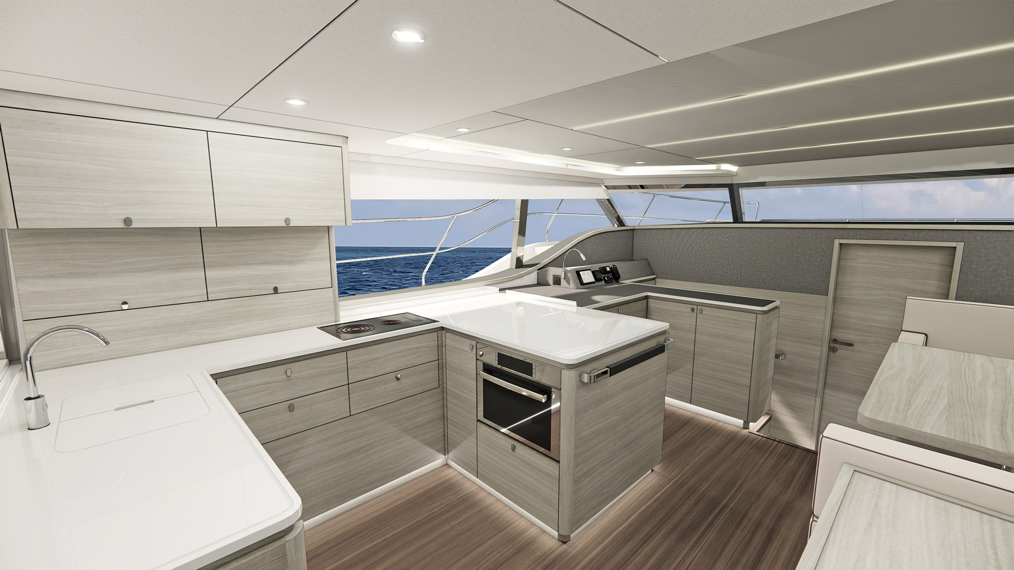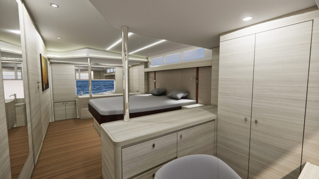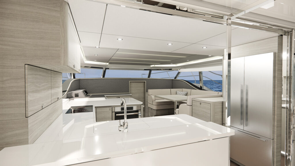 The beamy power cat’s commodious spaces emphasize indoor-outdoor living and flexibility.