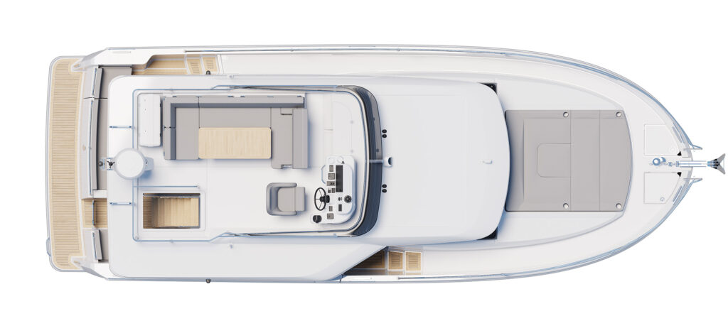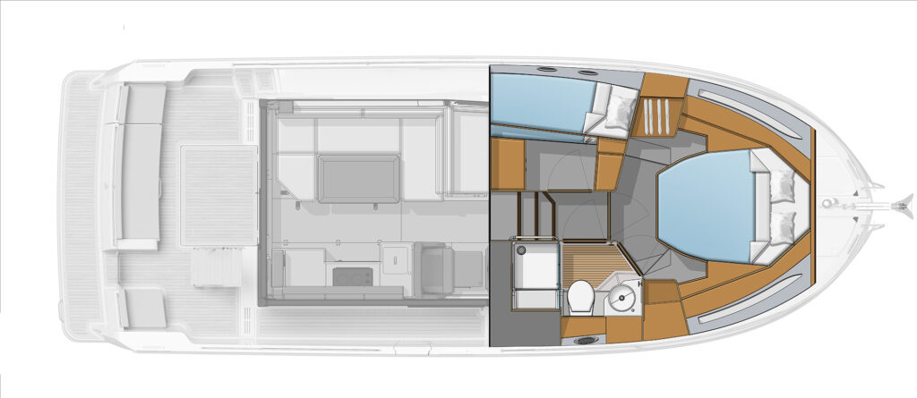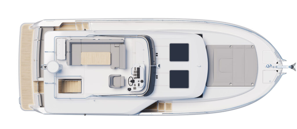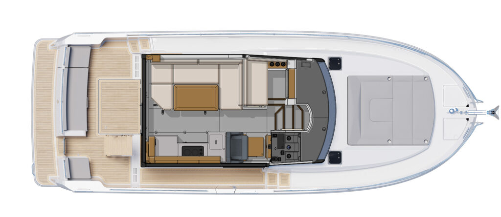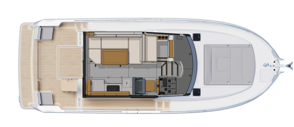 On the 37, buyers the choice of a Sedan or Flybridge version, something the France-based company offered with the Swift Trawler 41 that splashed in 2019. The 37-footers have the same salon and two-stateroom, single-head belowdecks layout but add something new on the upper deck of the sedan—a rooftop lounge that can be customized with a Bimini, moveable furniture, a space for a tender and SUPs, and more.