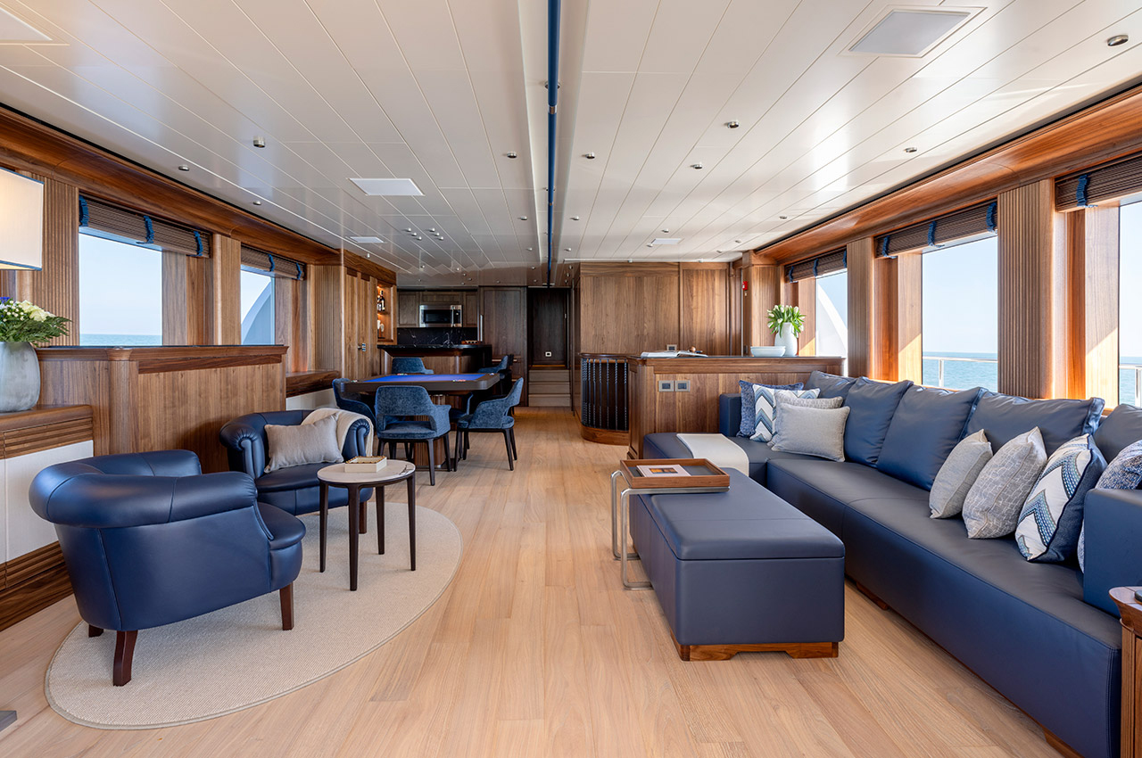 The owner’s full-beam stateroom is situated amidships on the lower deck. Adjacent to this luxurious stateroom are two twin cabins, each equipped with a Pullman bed to accommodate additional guests. At the forward end of the lower deck, a VIP suite offers a private and elegant retreat.