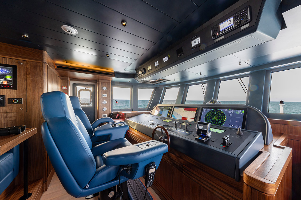From the builder: “The yacht’s project has been developed for long voyages also in high-latitude regions, so it includes an ice belt at the waterline and reinforced hull and rudders for icy conditions … The hull has been partially built with bulletproof steel plates, reflecting his intention to navigate remote and challenging seas. Another unique feature is a fourth pilot station in the engine room.”