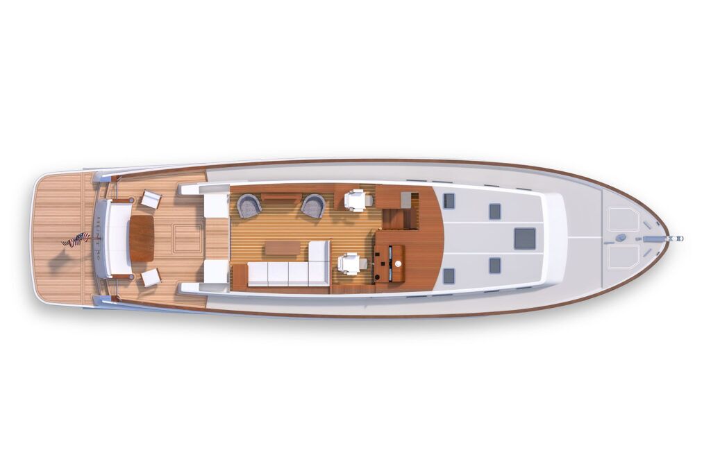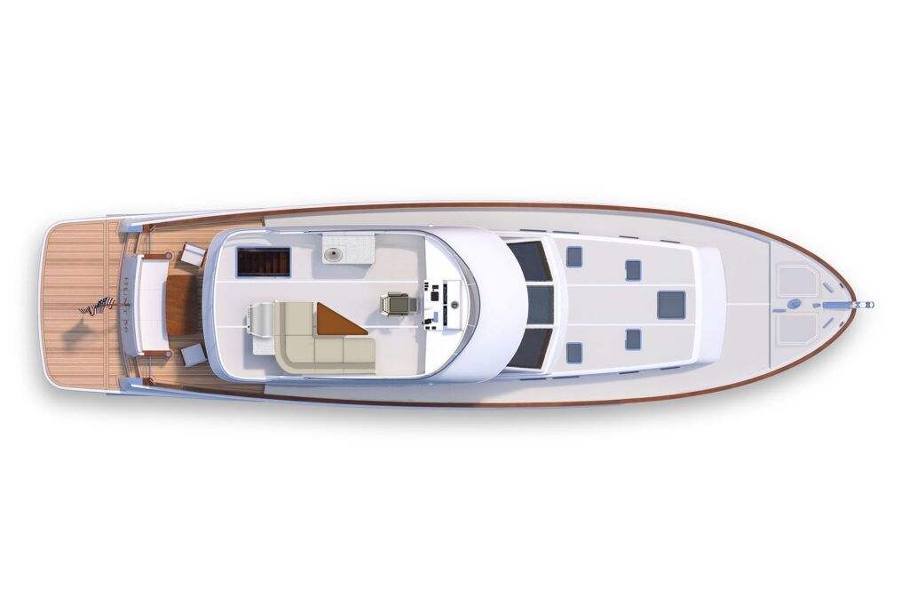The 56 can be had in flybridge and express versions. Each has an option of an extended roof that shades the cockpit.