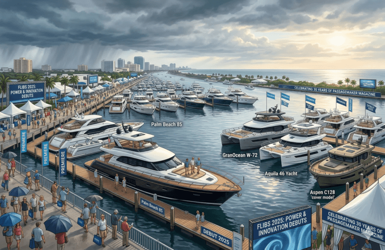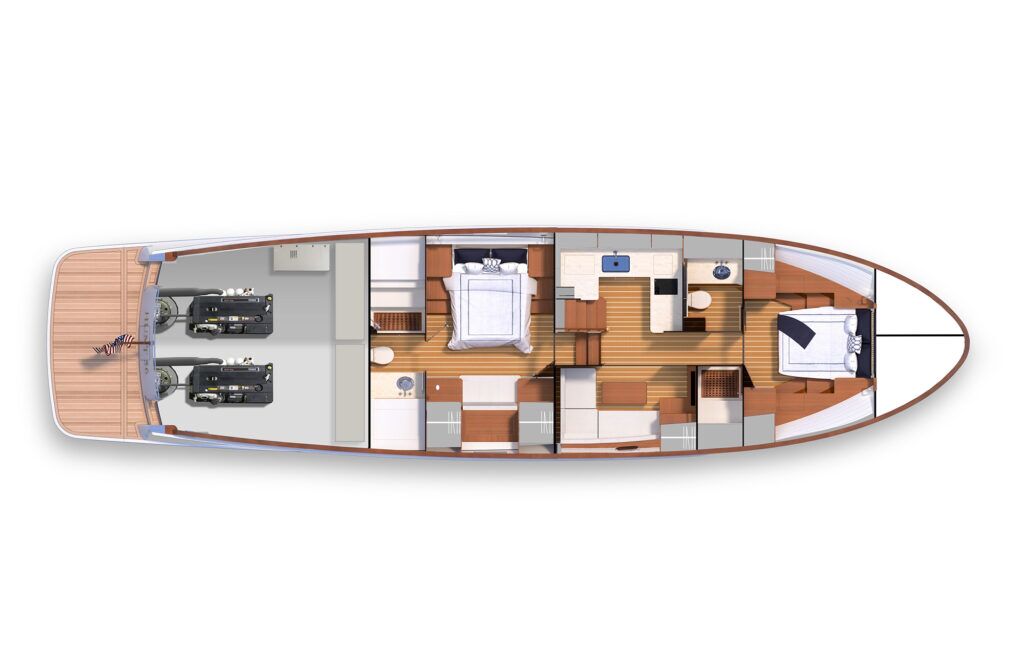 Renderings show a full-beam master stateroom with a VIP forward and a lounge that flanks the galley down. A three-stateroom configuration is an option.