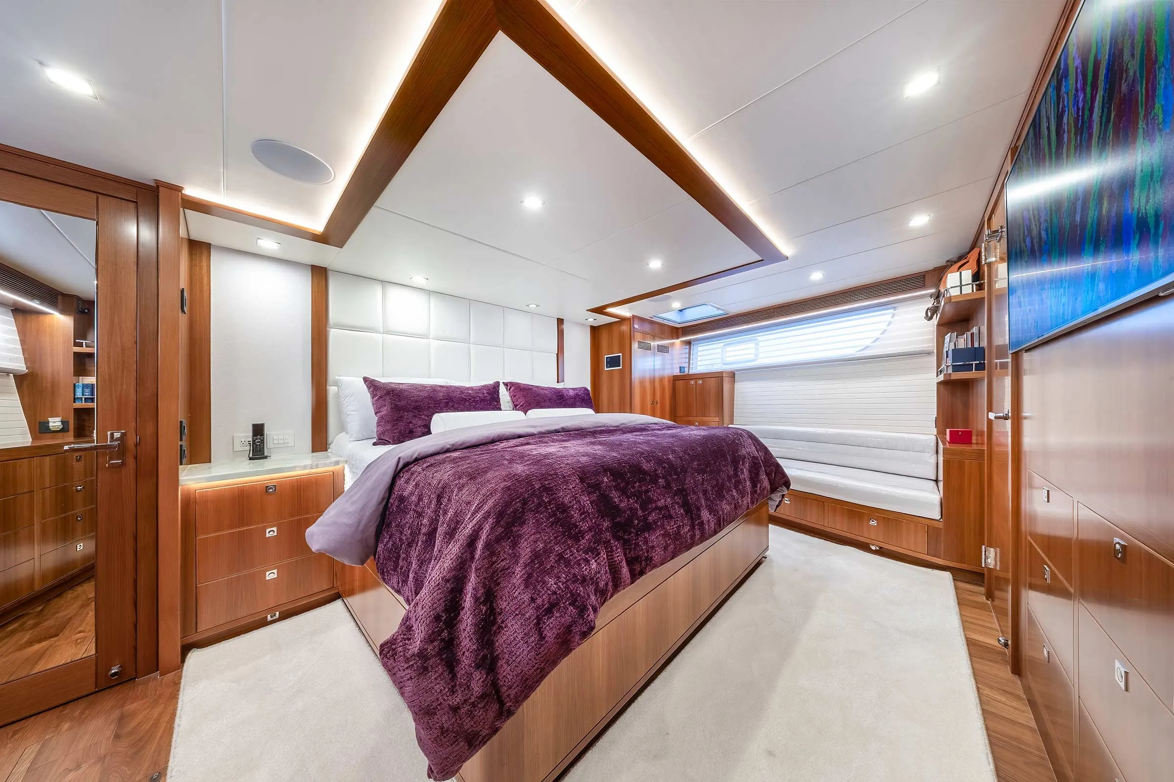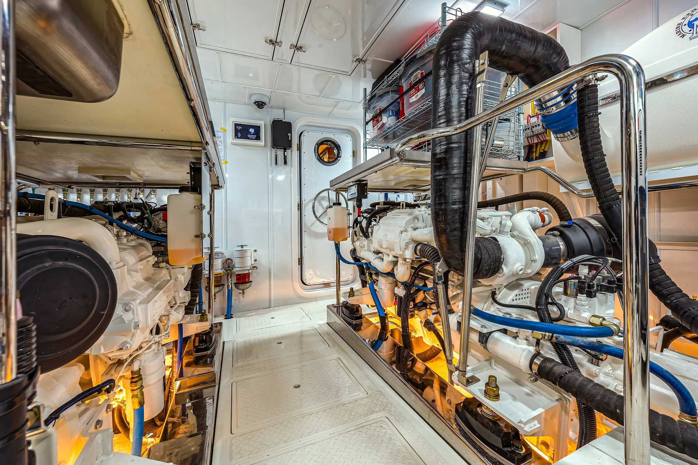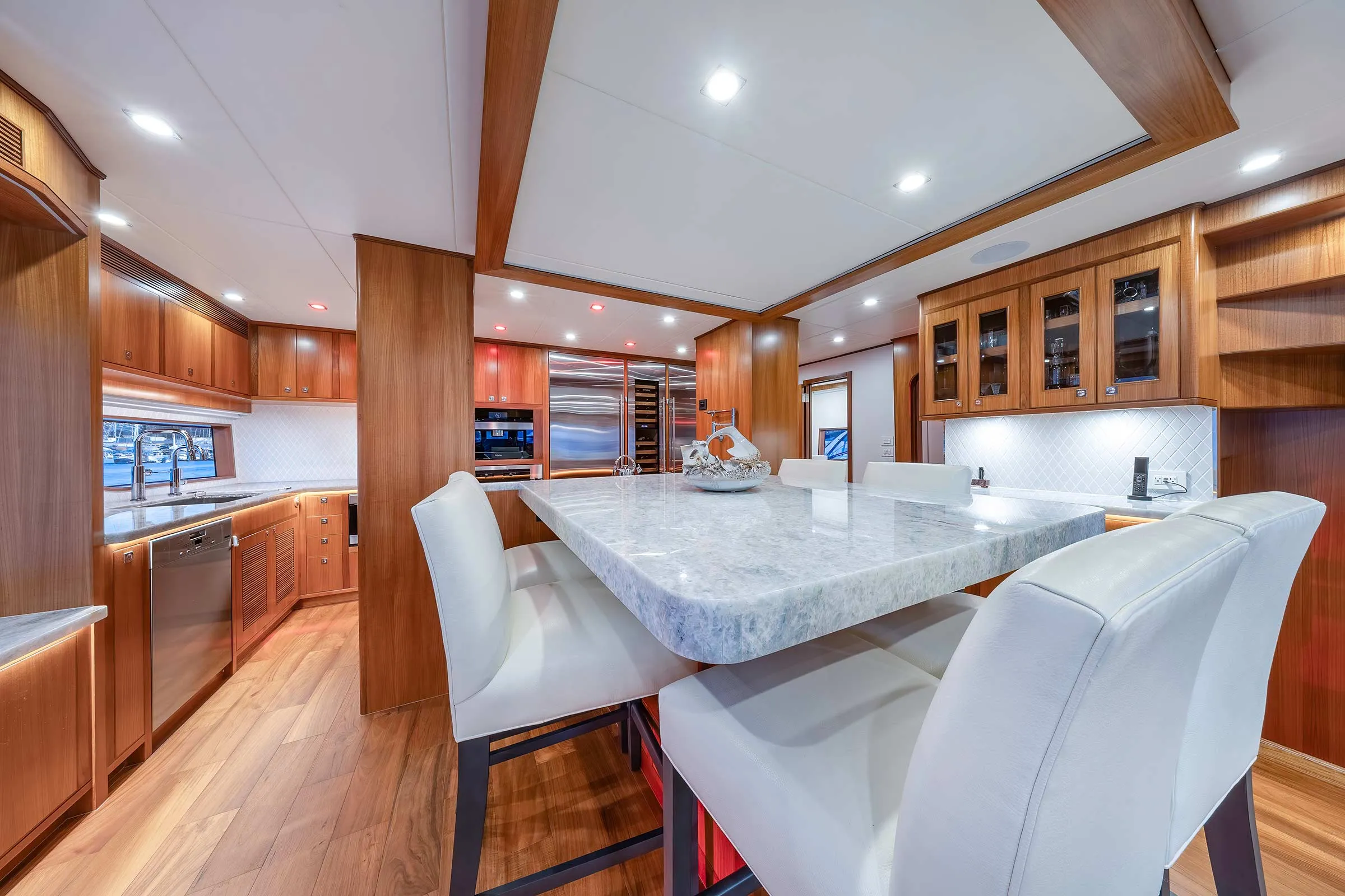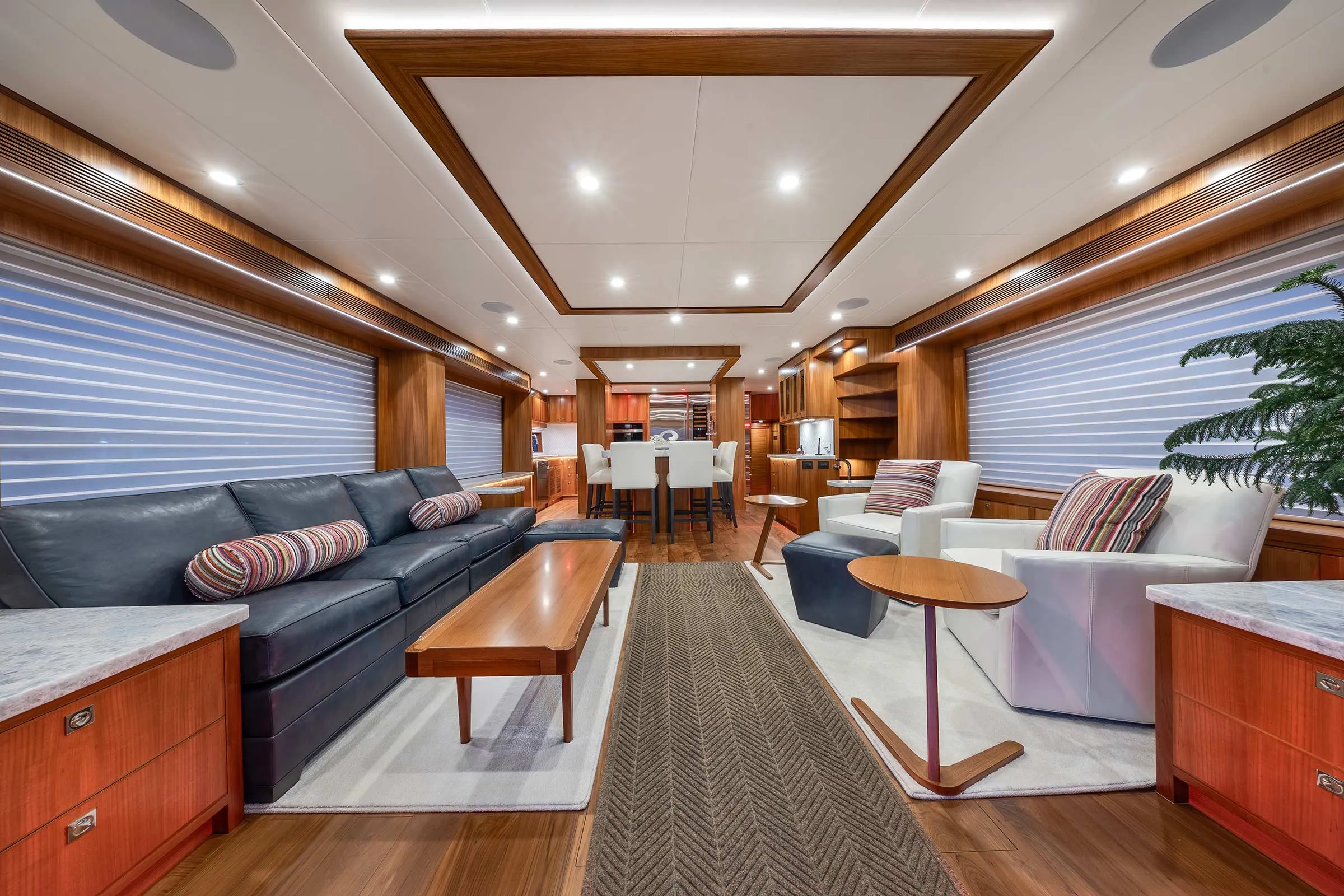 Hull No. 3 gets a three-stateroom layout with a main deck master and a pair of staterooms belowdecks. Her owners chose the skylounge option (a fourth stateroom can be in place of the skylounge). The range of custom options include: a jacuzzi spa, a steam shower in the master stateroom and a LiON battery bank, to name a few. For true four-season cruising, there are heated floors throughout and a Kabola diesel heater system integrated into the chilled-water A/C system.