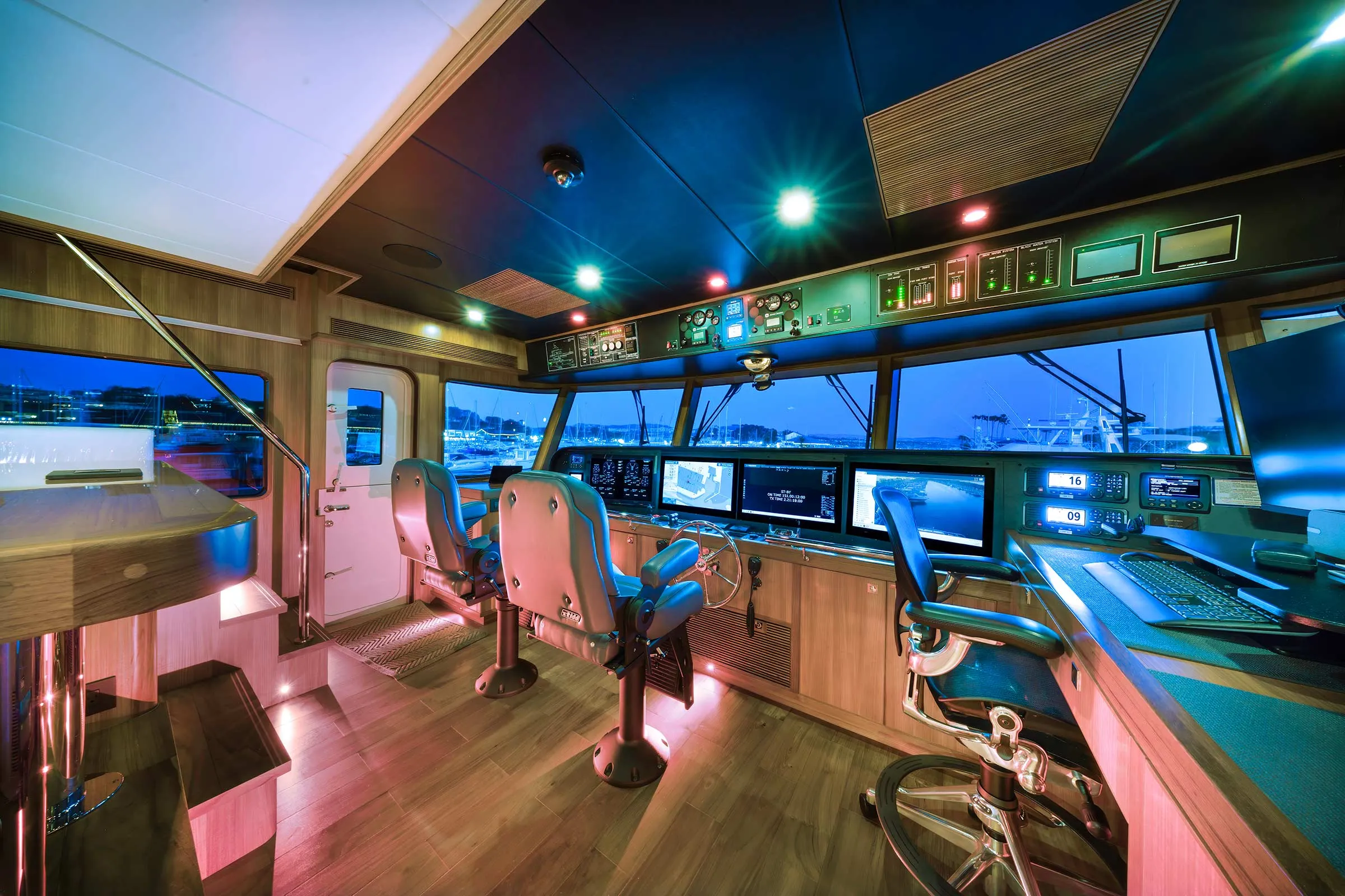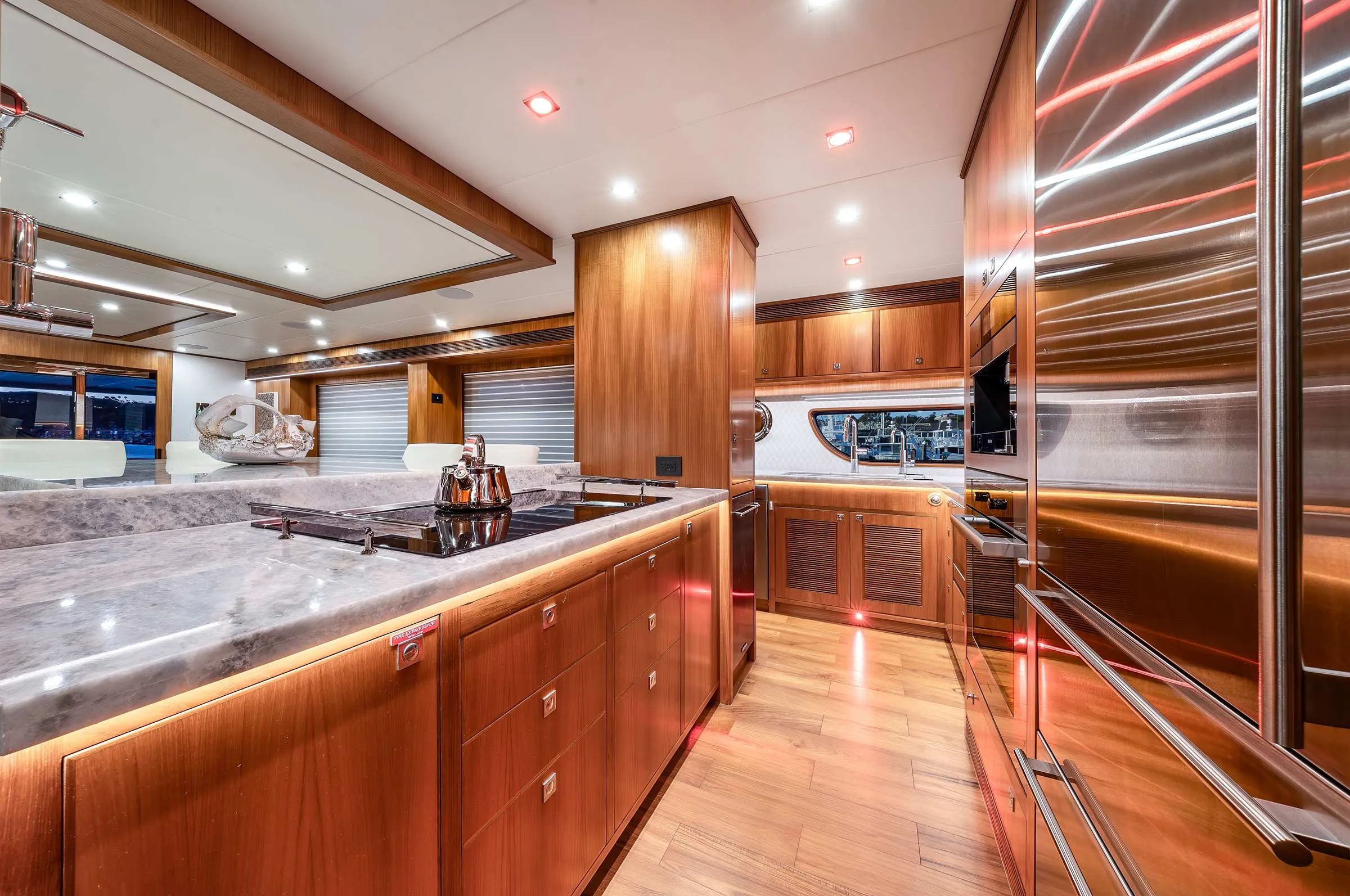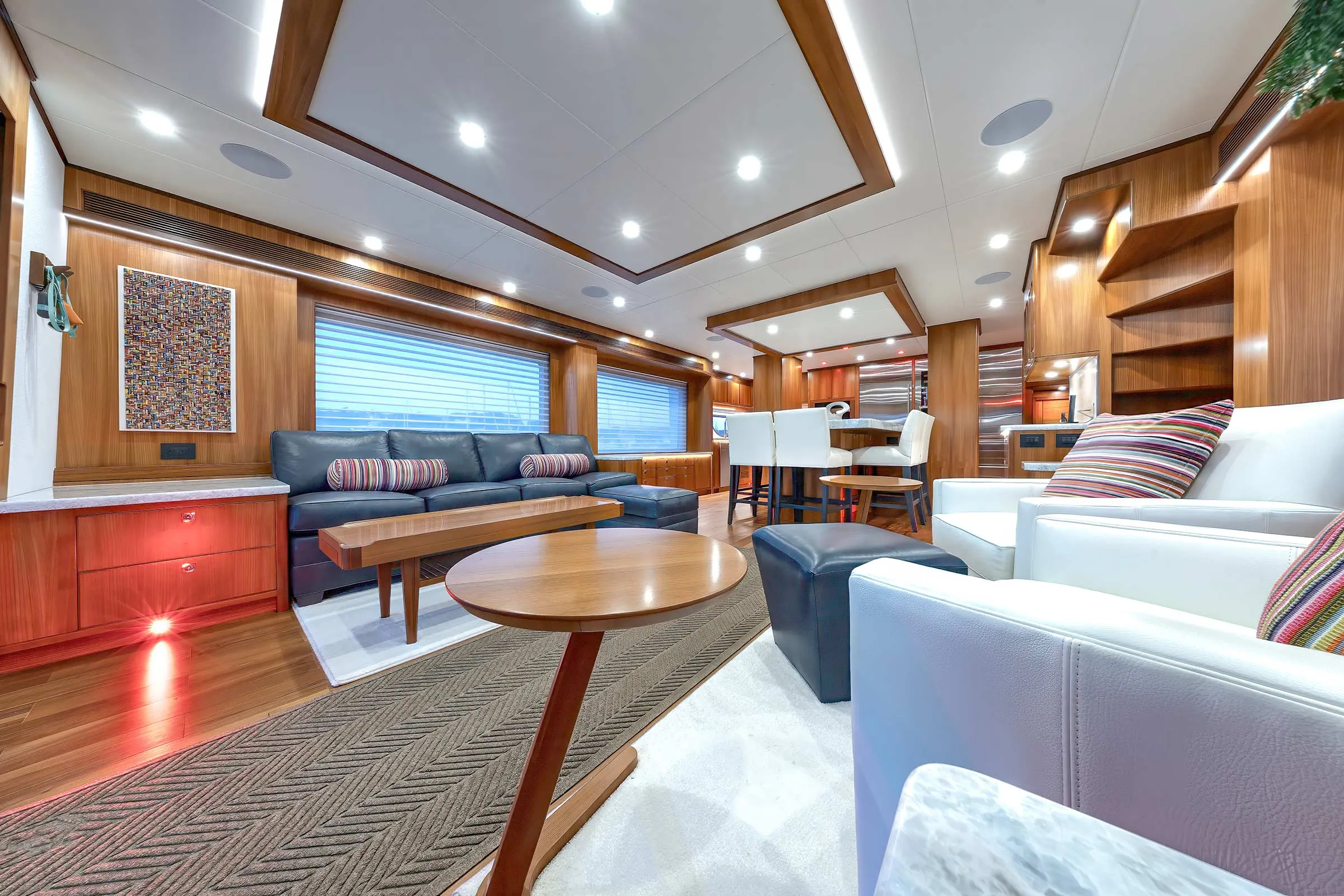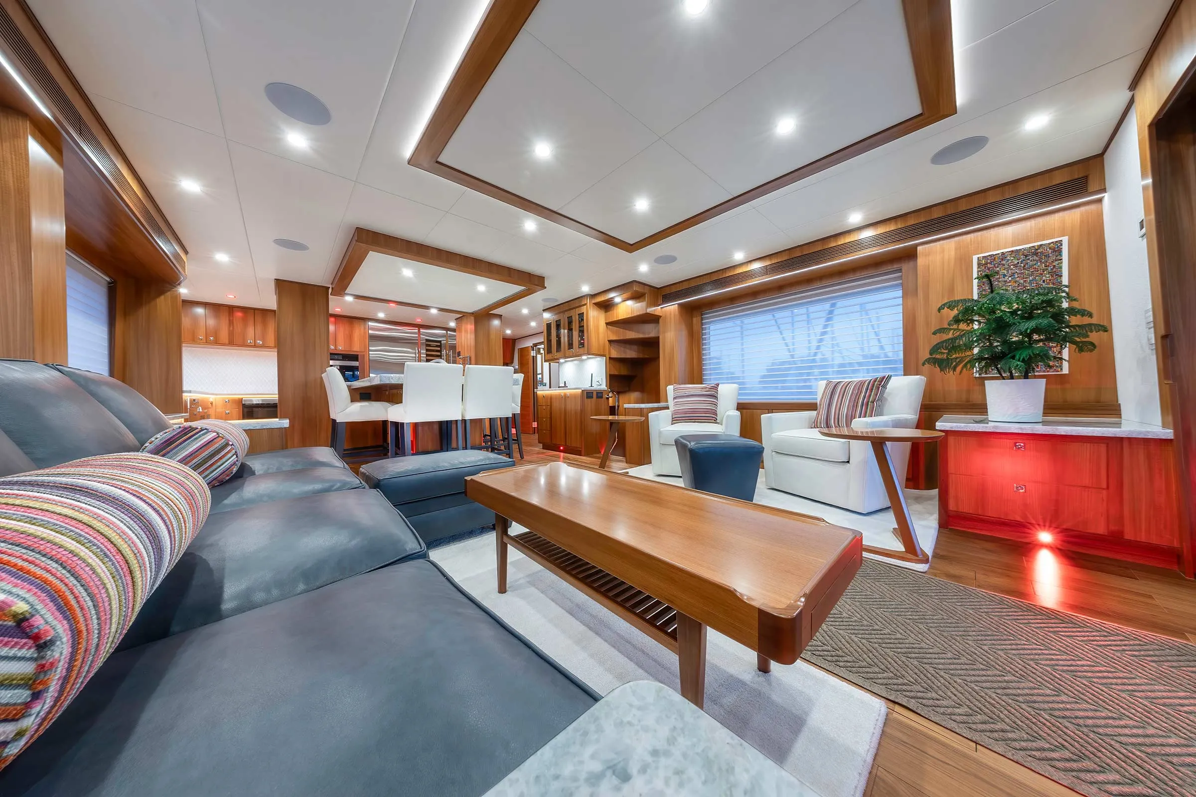 Hull No. 3 gets a three-stateroom layout with a main deck master and a pair of staterooms belowdecks. Her owners chose the skylounge option (a fourth stateroom can be in place of the skylounge). The range of custom options include: a jacuzzi spa, a steam shower in the master stateroom and a LiON battery bank, to name a few. For true four-season cruising, there are heated floors throughout and a Kabola diesel heater system integrated into the chilled-water A/C system.