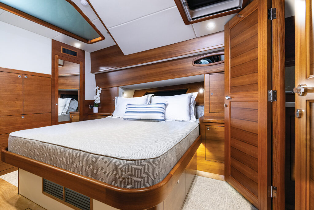 The 62 was developed from the 60 for those that wanted roomier accommodations. The boat retains the full beam, amidships master with an athwartships king berth, and there’s a VIP forward with a walkaround queen berth. The boat’s extra length also allows for the third stateroom to have two berths: a single and, two steps down, a double berth with an en suite head. A day head in the companionway shares duties with the VIP.