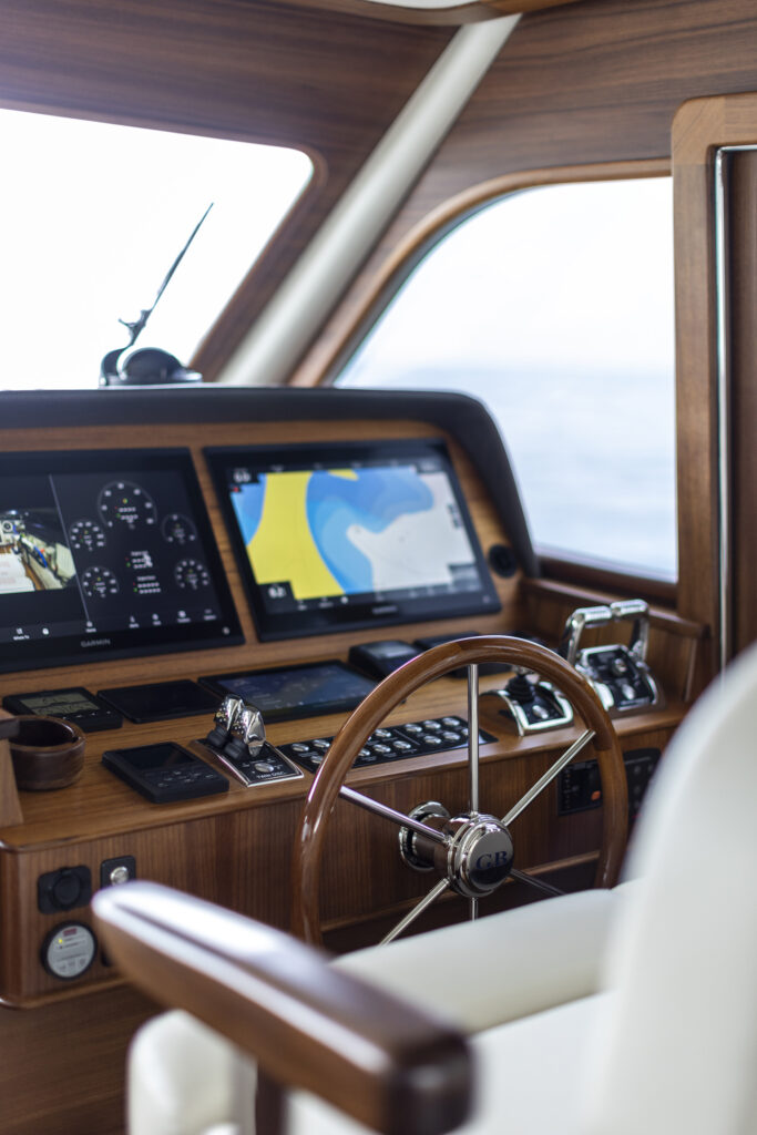 Twenty minutes later, at the flybridge helm’s destroyer wheel, I had forgotten any thoughts of comparison to the Grand Banks models of yore. I pushed the throttles, and in seconds, she jumped from 11 knots to just under 26 knots and 2000 rpm. Conditions were calm, so I chased the wakes of commercial boats as they returned from sea. Her hull made mincemeat of them. I made sudden, fast turns and simply could not unnerve the boat. The response was effortless, agile and confident. I firewalled the Twin Disc Quick Shift transmission, and the 62 topped out at 30 knots, with her power plants—twin 1,000-hp Volvo Penta D13s— hitting 2400 rpm, their max output, on the nose.