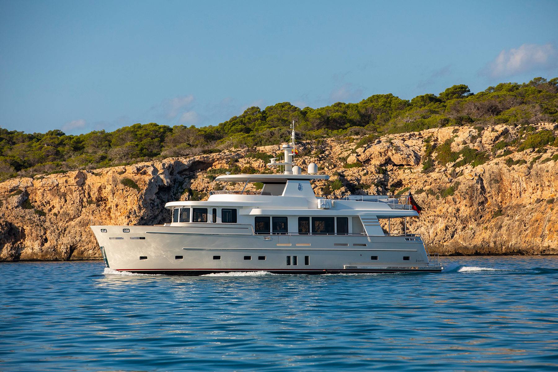 The 77-foot Van der Valk Explorer Felis is a long-range cruiser with transatlantic capability.