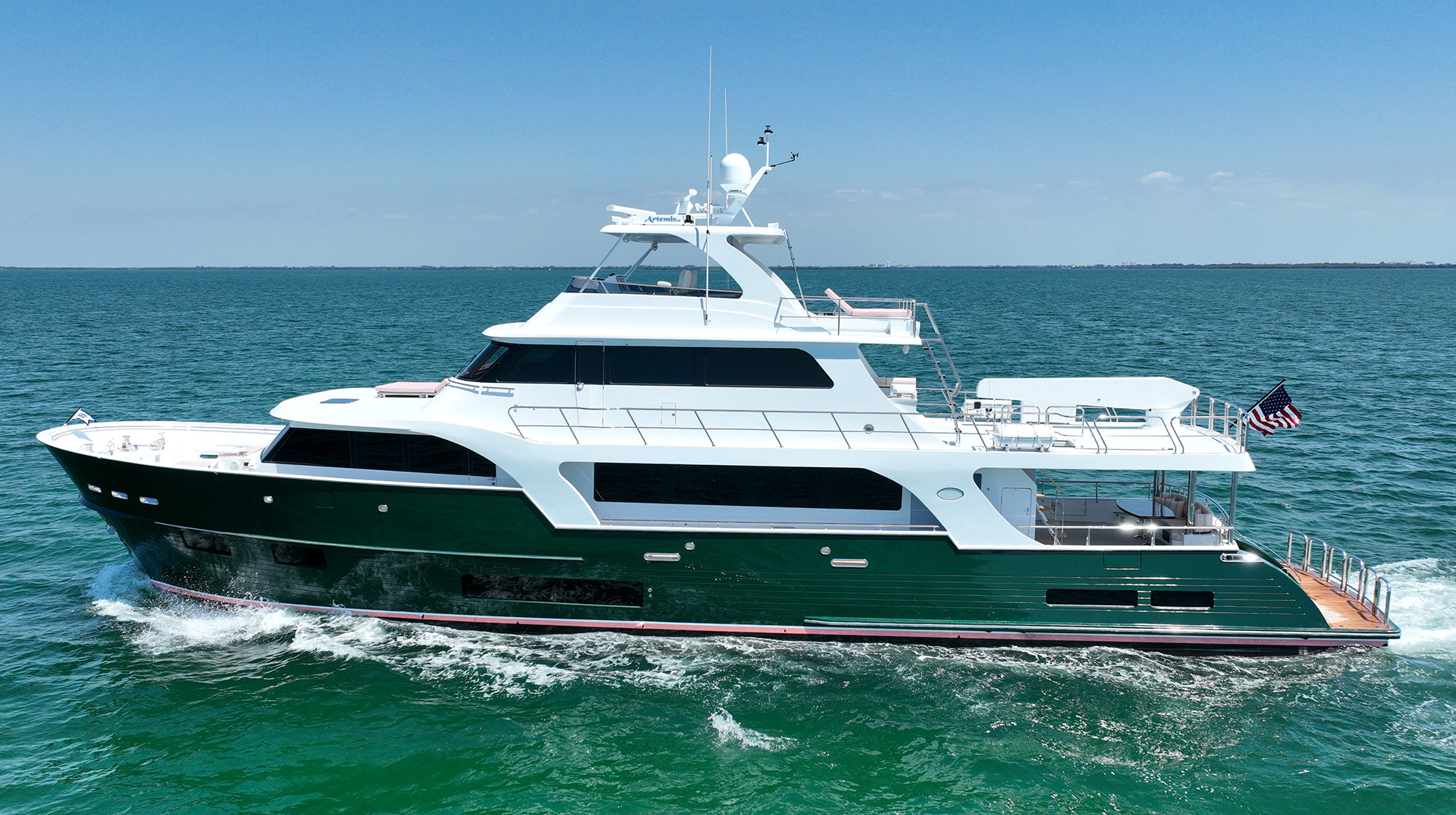 Explore the Marlow 90V: a 97-ft luxury yacht with a stunning green hull, five staterooms, a speedy 25-knot top end and ocean-crossing capability.