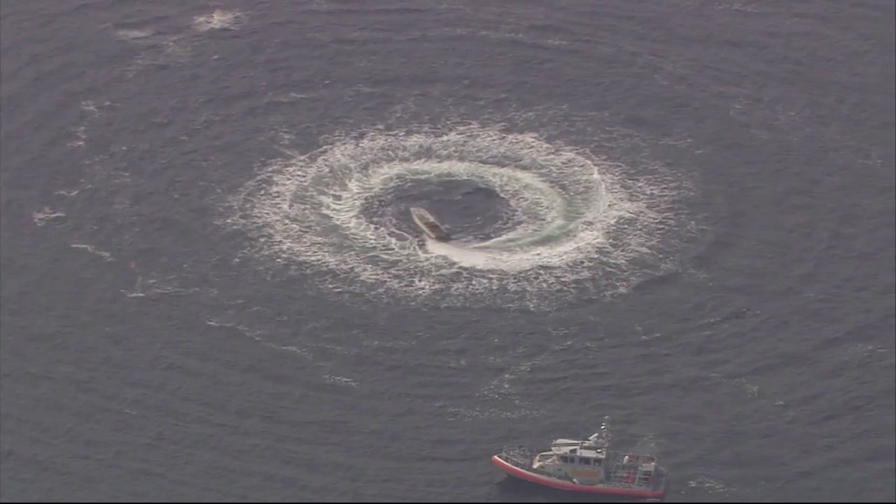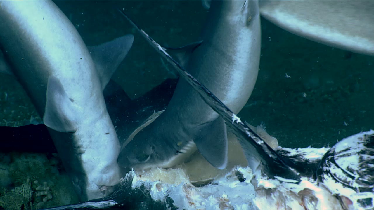 A grouper and shark encounter is observed from the underwater vehicle deployed off of the NOAA Ship Okeanos Explorer positioned off of the SE United