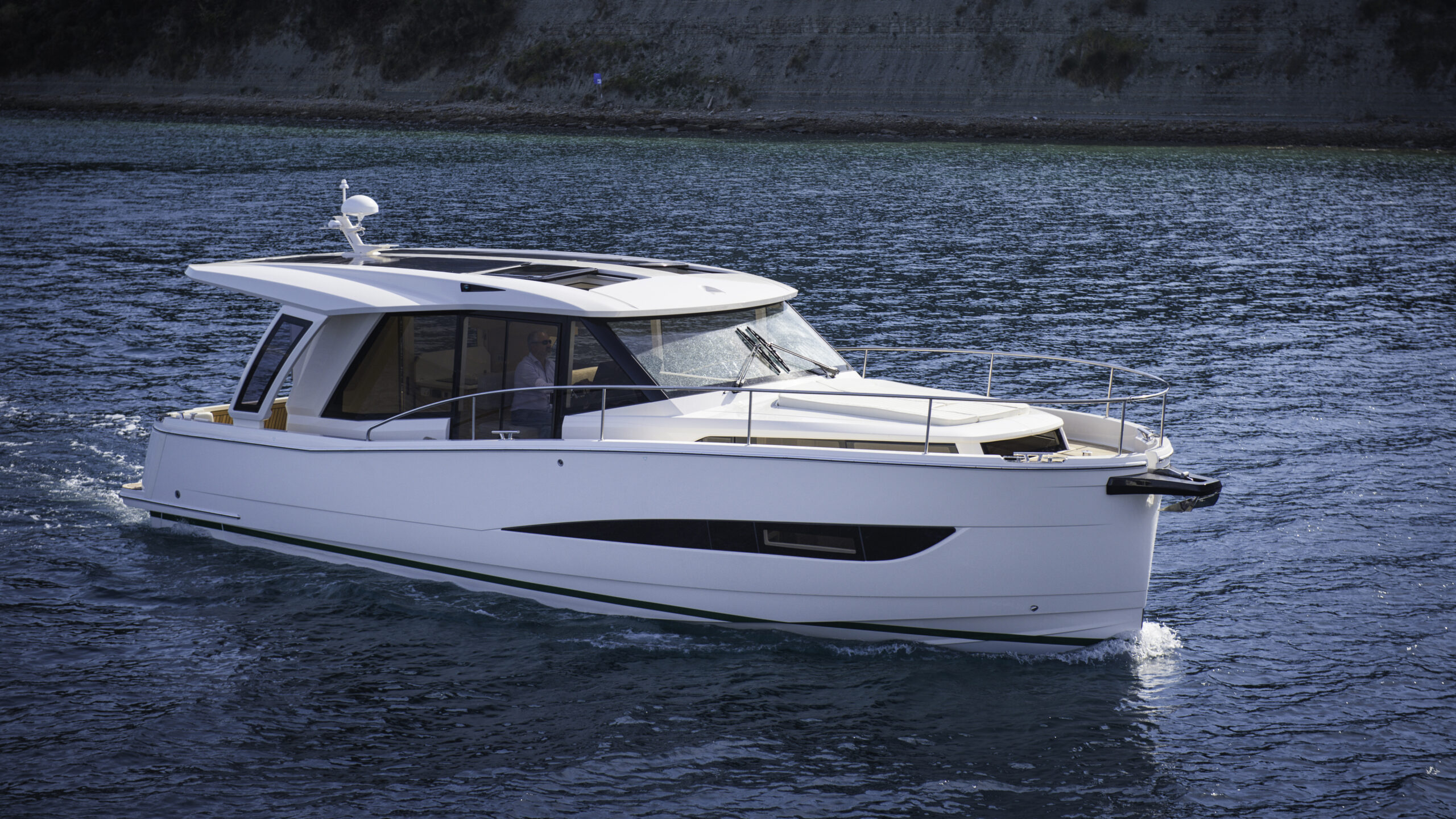 The Greenline 45 Fly Hybrid will do 6 knots electric-only top speed and does a electric-only cruise at 4 knots