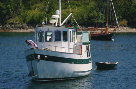 Behold the 39-foot trawler Bliss about to anchor behind Gizmo in Pulpit Harbor. She’s a custom Jay Benford design that already turns heads, but note the cabin top presence of both Inmarsat FB150 and Iridium Pilot antennas.