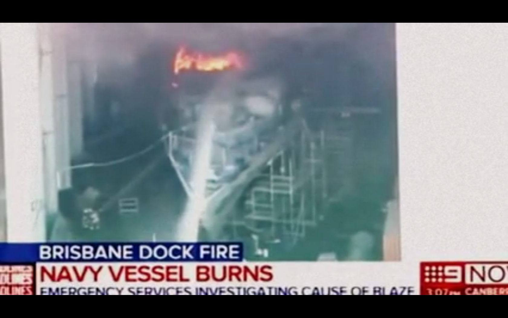 The Australian navy patrol boat HMAS Bundaberg became engulfed in flames yesterday during maintenance work in a Brisbane dry dock.